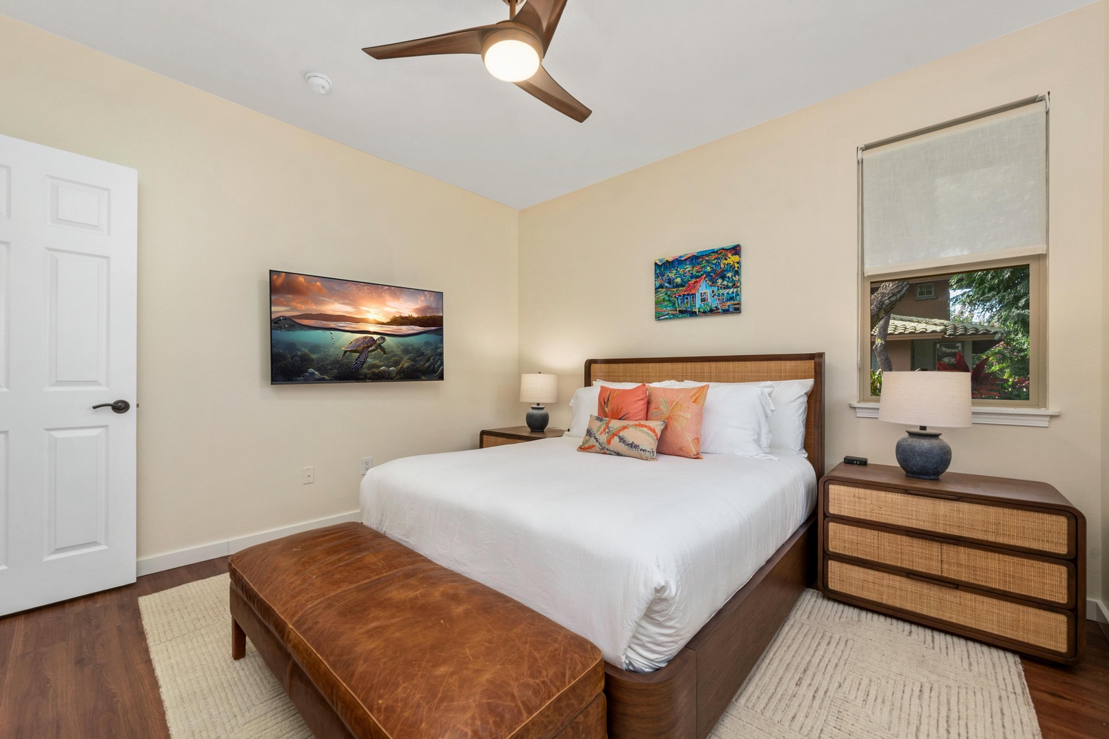 Sink into crisp white linens and drift off under the gentle breeze of your ceiling fan in this serene bedroom retreat.