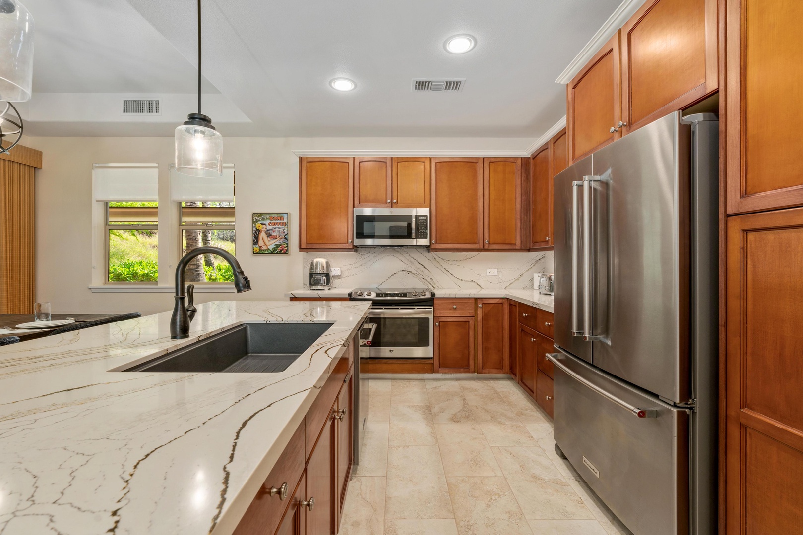 Your fully equipped kitchen features stunning marble countertops, stainless steel appliances, and warm wood cabinetry perfect for preparing memorable meals together.
