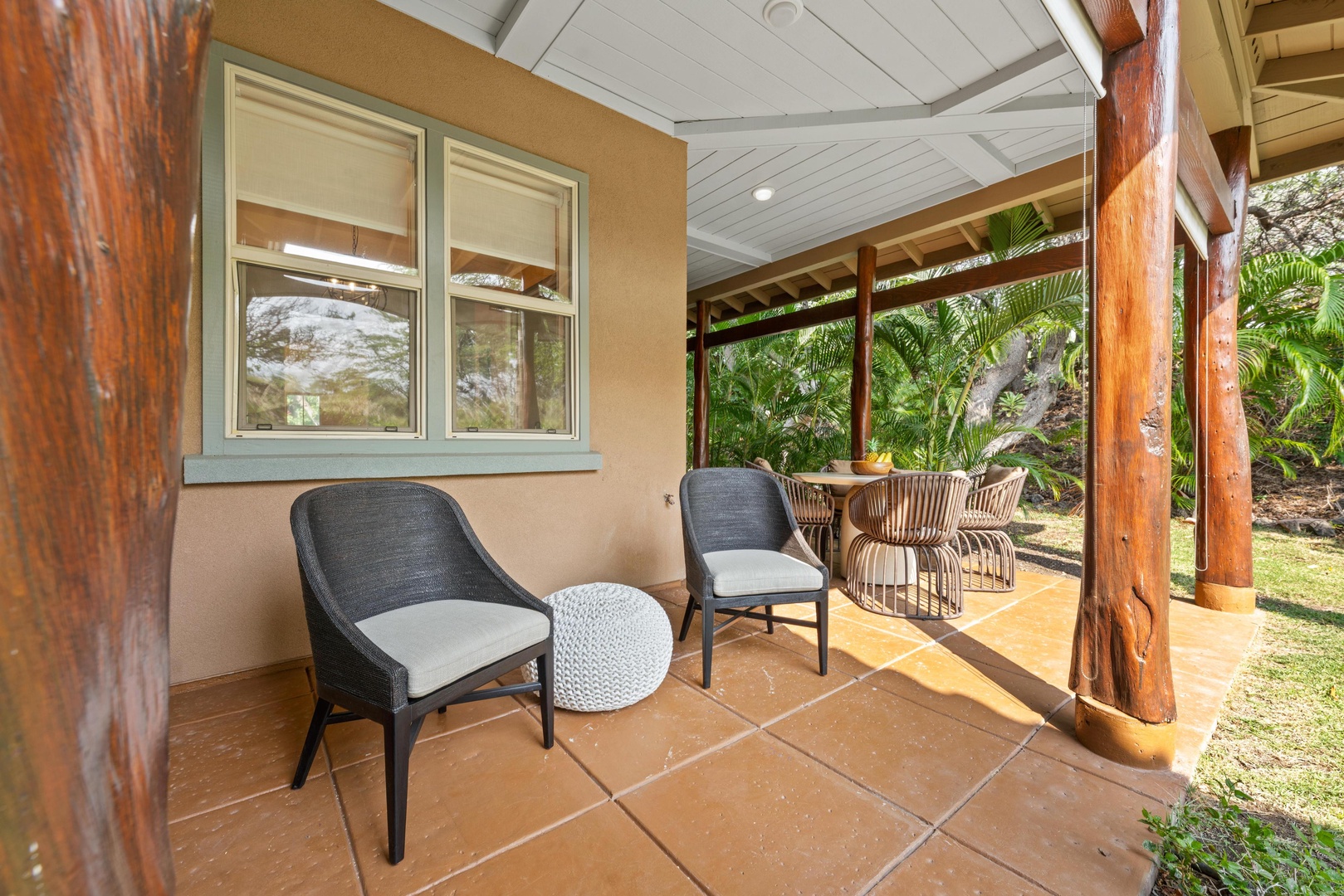 Your covered patio offers the perfect tropical dining escape, surrounded by lush palms and garden views for memorable outdoor meals.