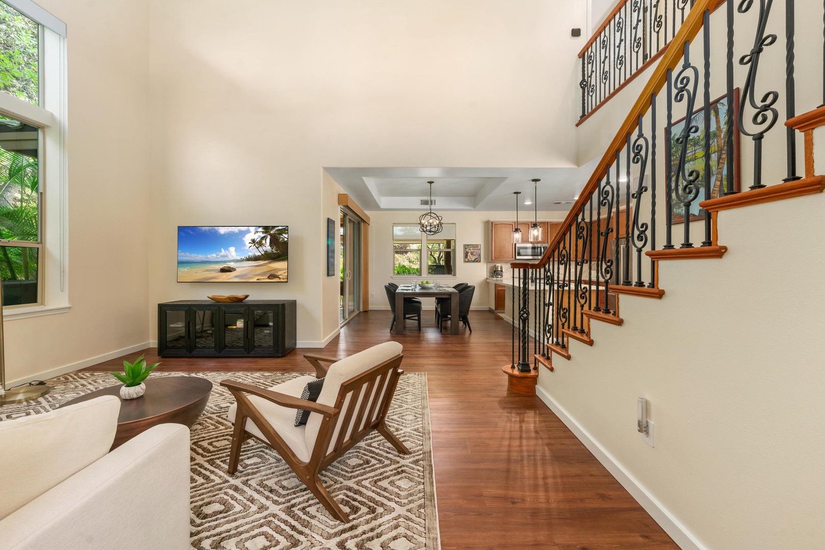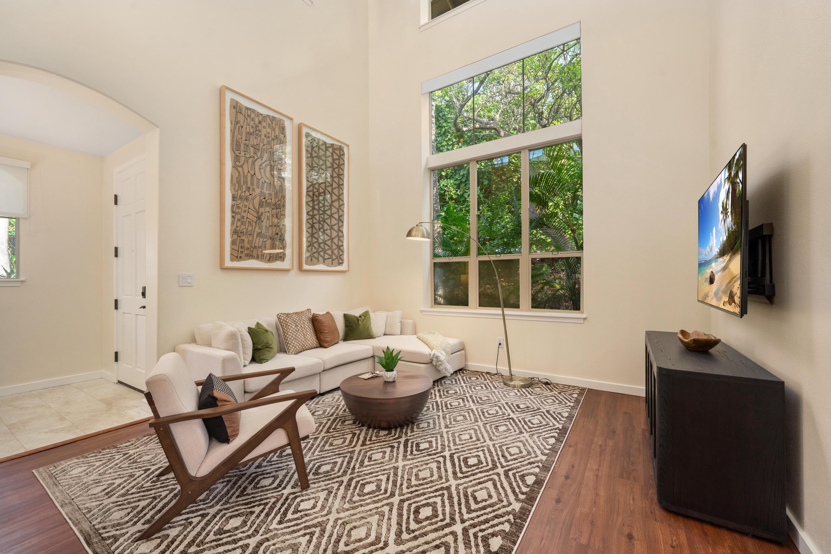 As an end unit, the home is filled with abundant natural light, creating an open and inviting atmosphere throughout. The living room features soaring 18-foot ceilings that enhance the sense of space and airiness, while Minka ceiling fans add both comfort and understated style. Artwork by local Hawaiian artists is displayed throughout the home, adding warmth and an authentic connection
