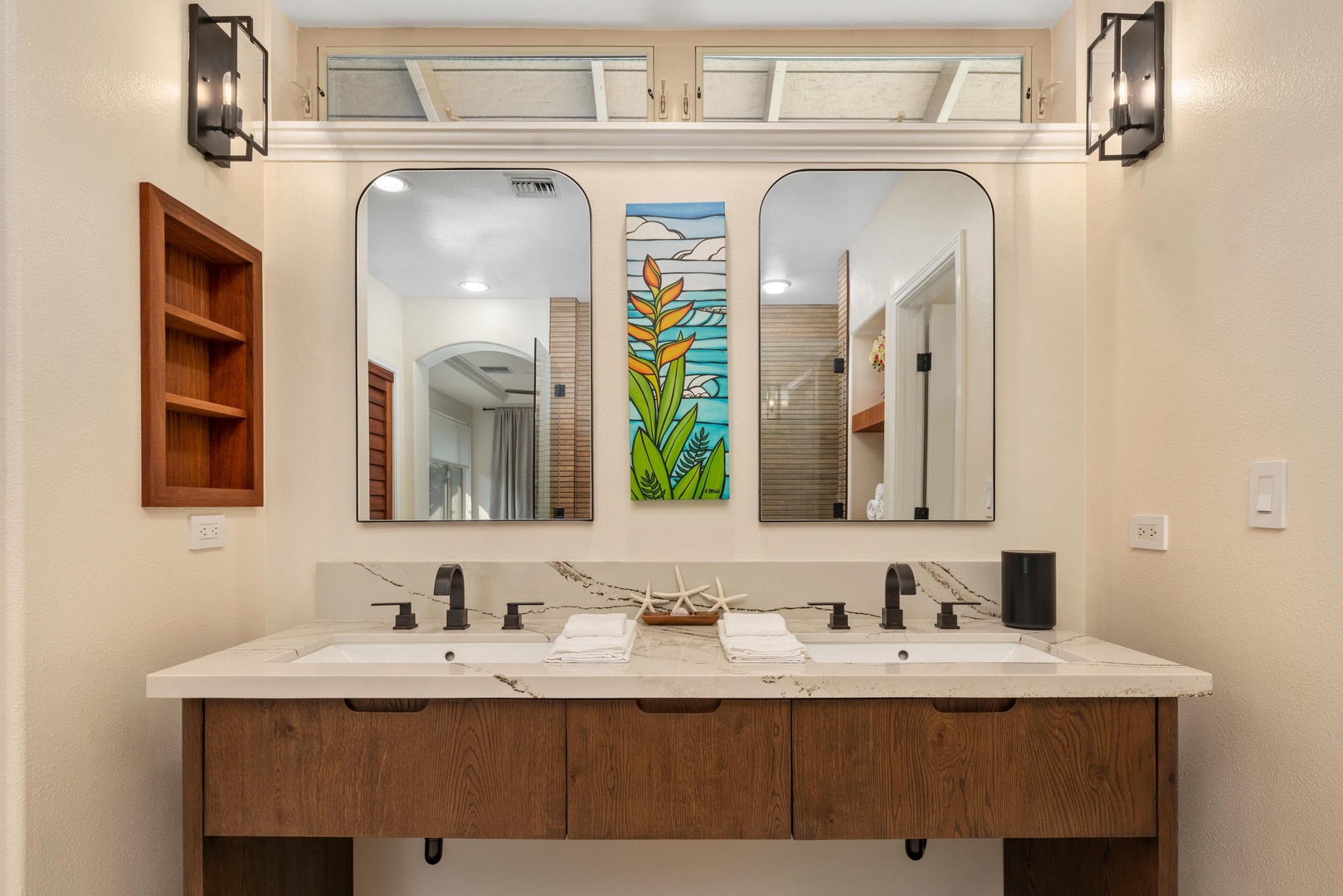 Start your mornings at this beautifully appointed double vanity, where warm wood tones and colorful tropical art create your perfect getting-ready space.