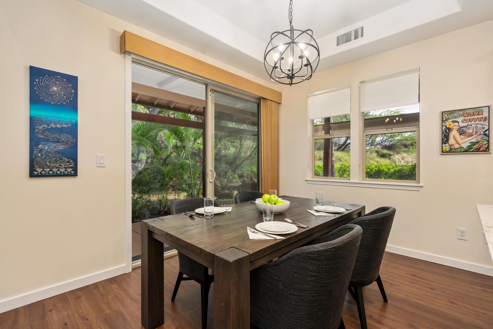 Your elegant dining space features a beautiful wood table set for four, with tropical garden views creating the perfect backdrop for memorable meals.