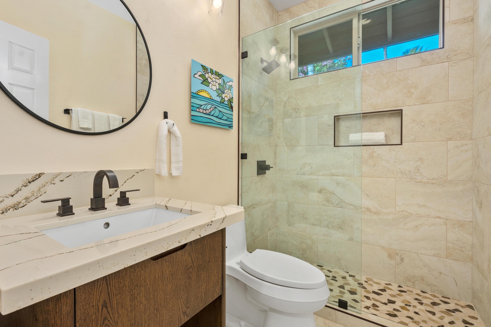 Unwind in your spa-like bathroom featuring marble finishes, a sleek glass shower, and coastal artwork that sets the perfect tropical mood.
