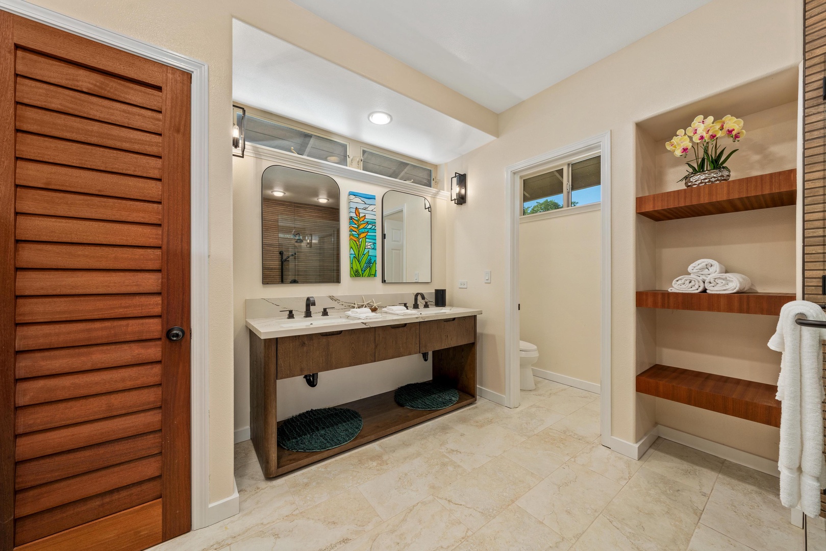 Your spacious bathroom features elegant double vanity, walk-in shower, and thoughtful built-in storage to keep your toiletries organized throughout your stay.