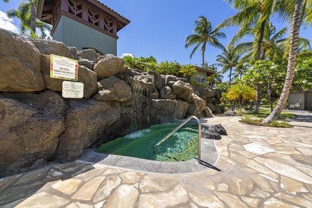 Resort-style swimming pool surrounded by tropical palms and stone features creates a perfect Hawaiian paradise setting.