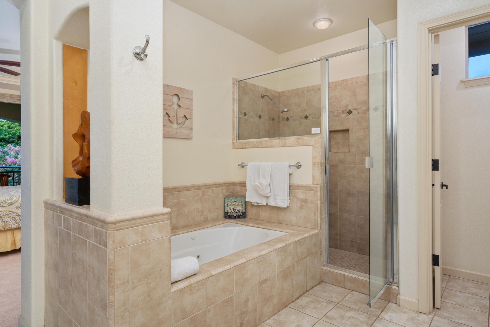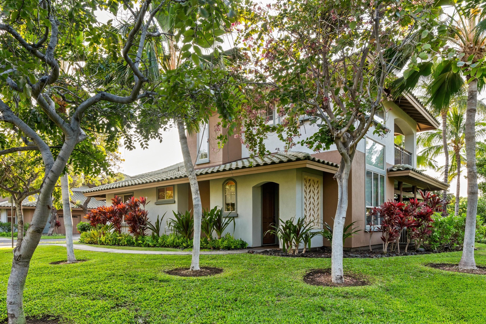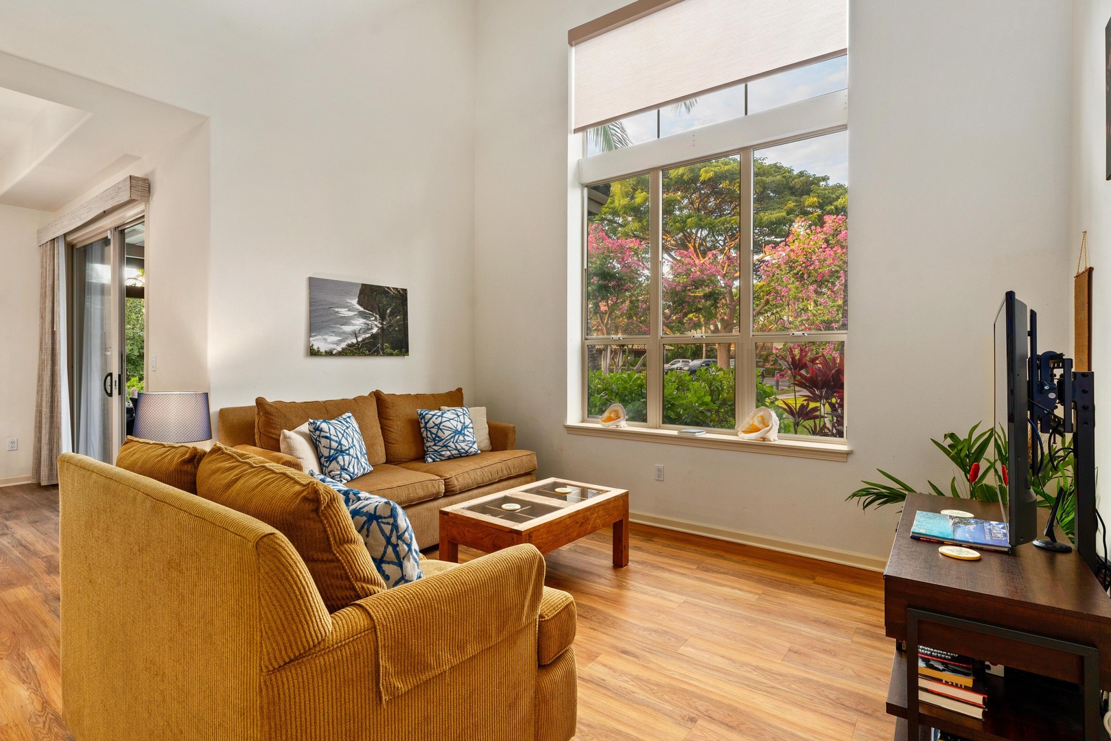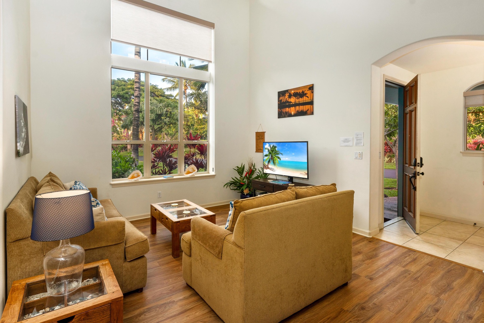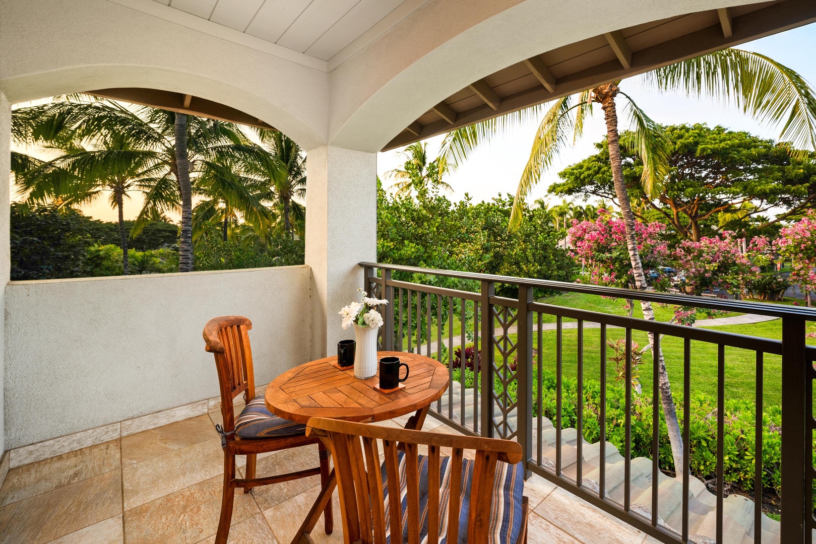 Covered lanai with views of tropical landscaping