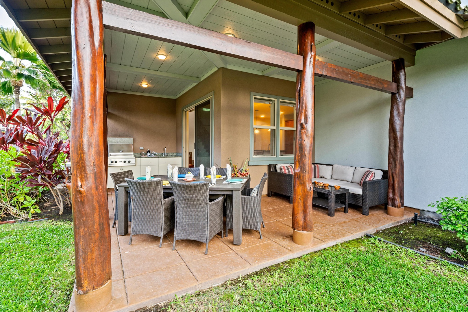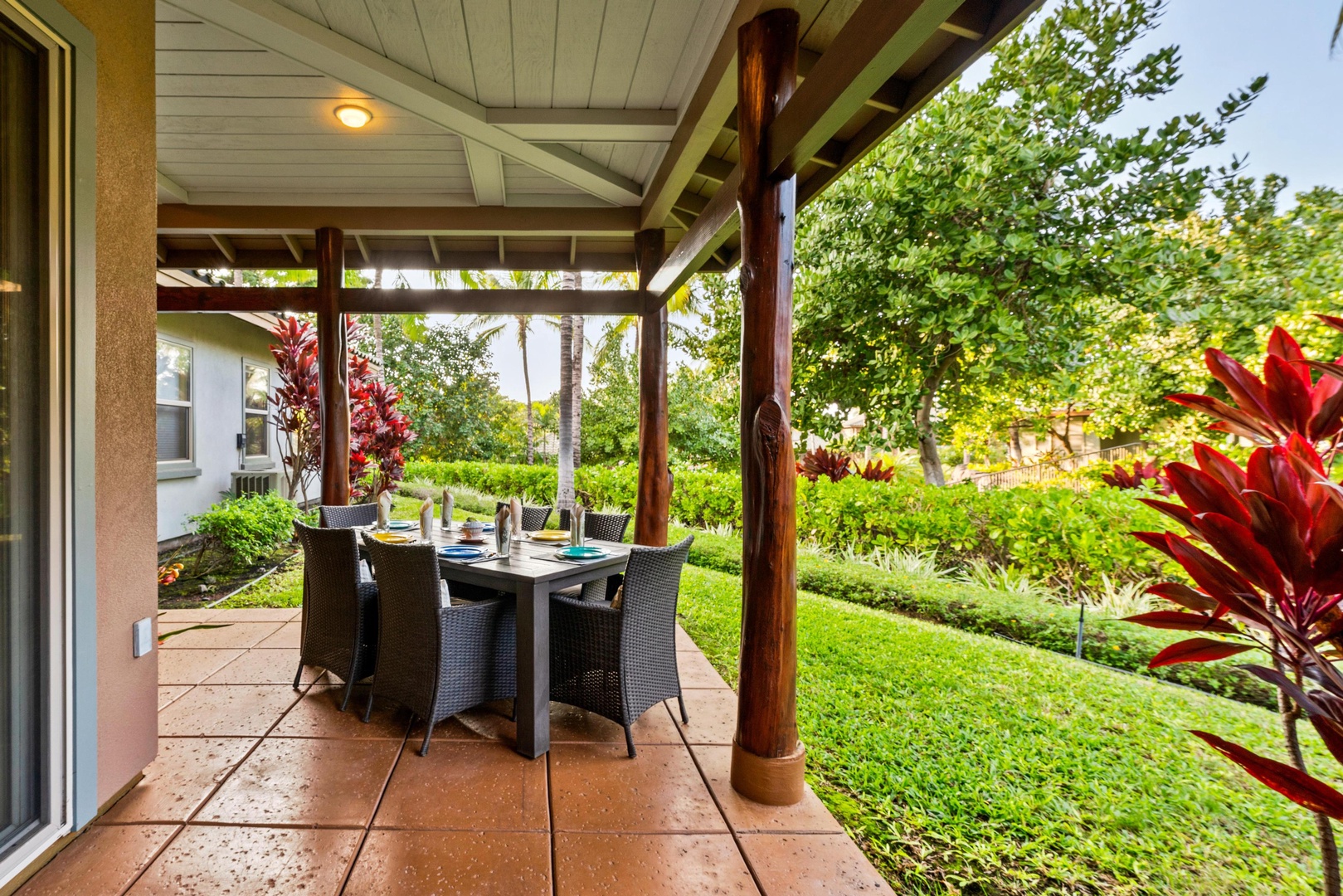 Covered lanai with seating for six surrounded by tropical greenery