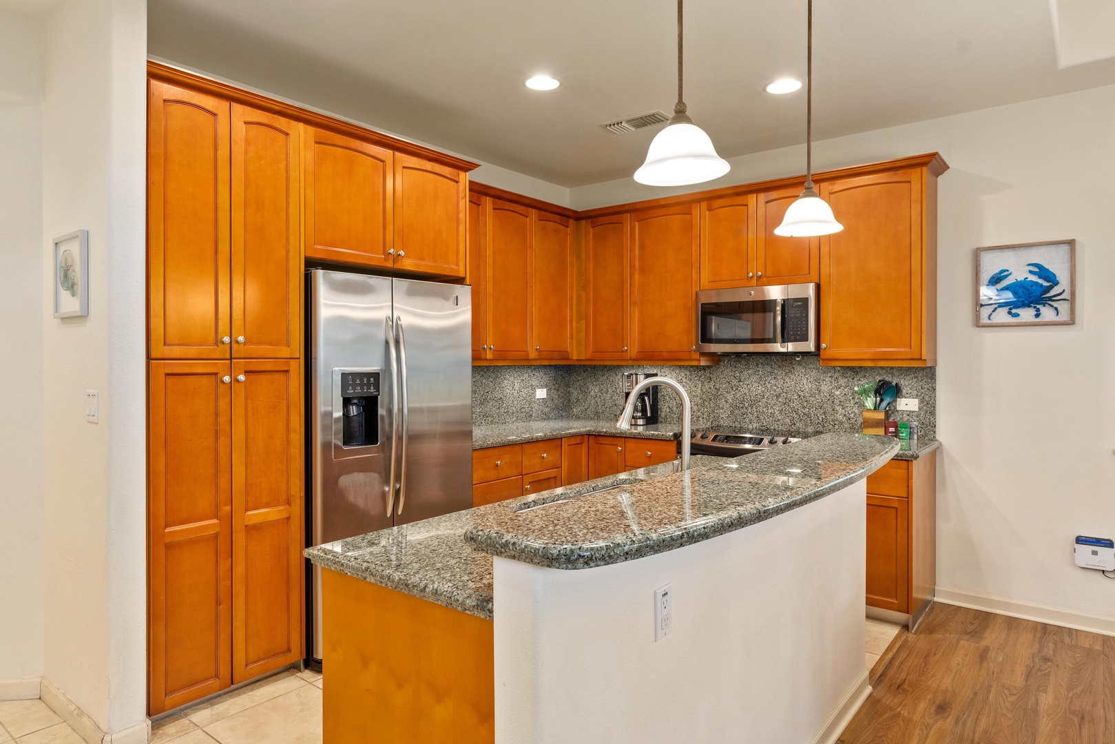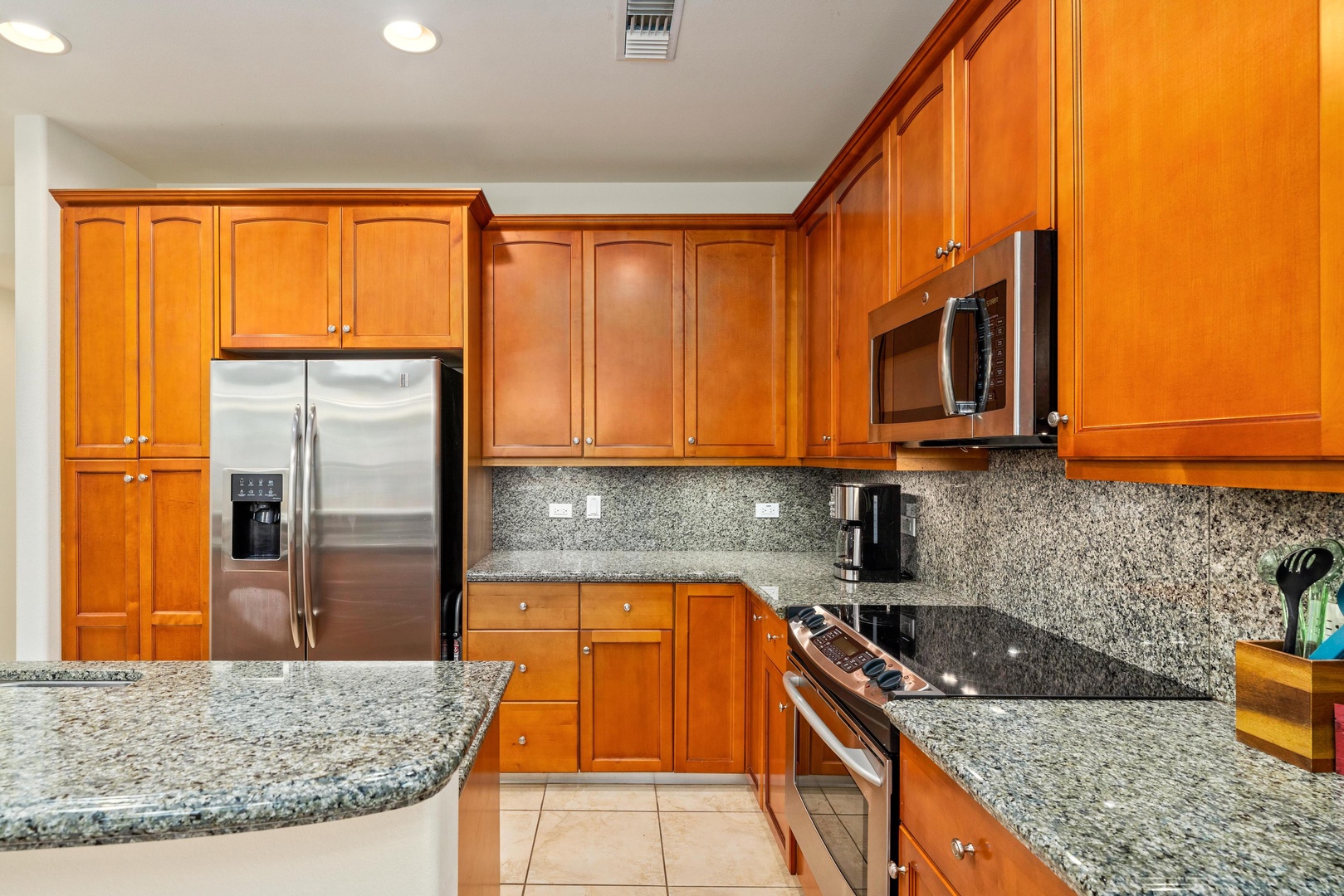 Full kitchen with granite counters and stainless steel appliances
