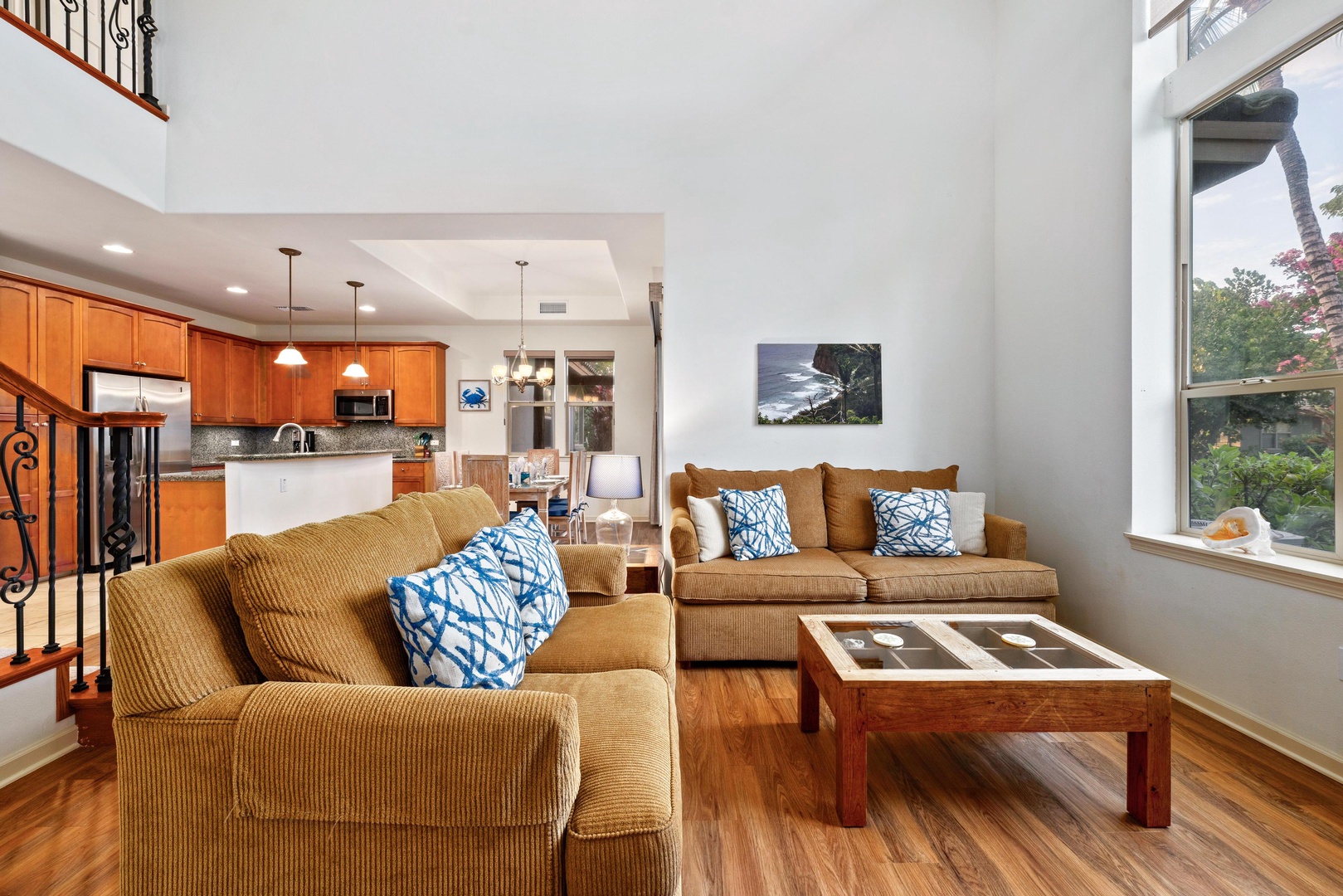 Spacious living room with vaulted ceilings and large windows