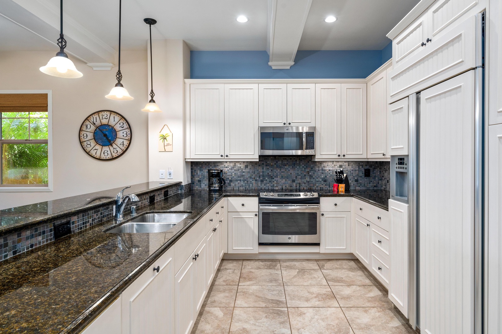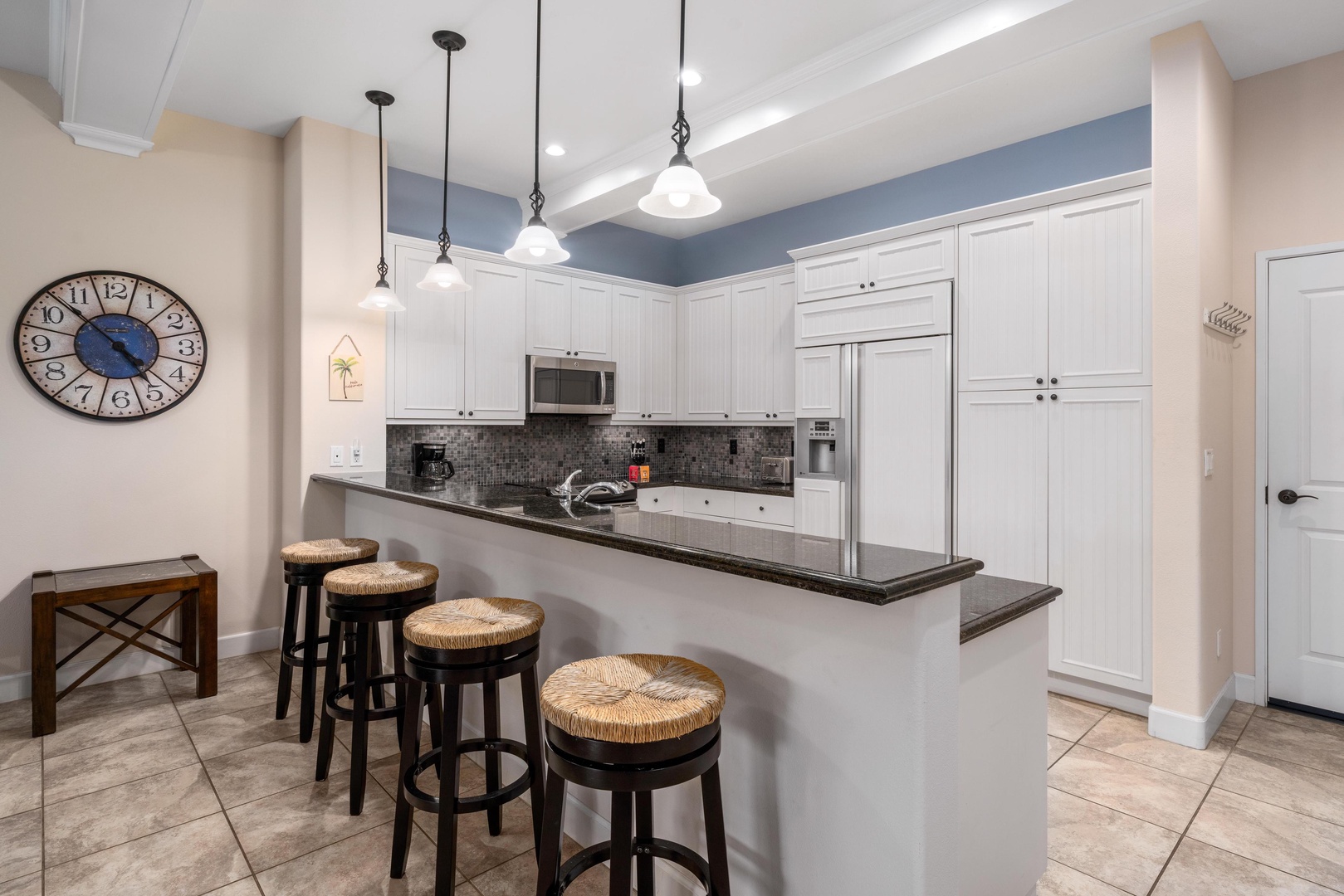 Full kitchen with breakfast bar and granite counters