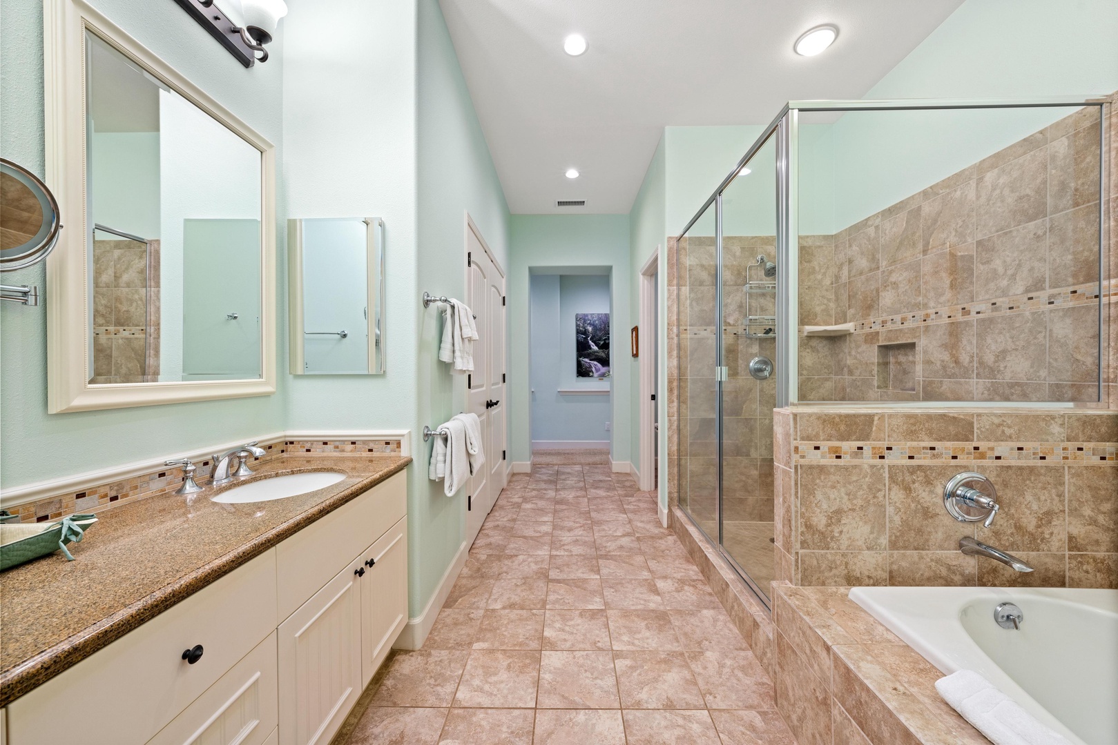 Ensuite primary bathroom with double vanity, walk-in shower, and soaking tub