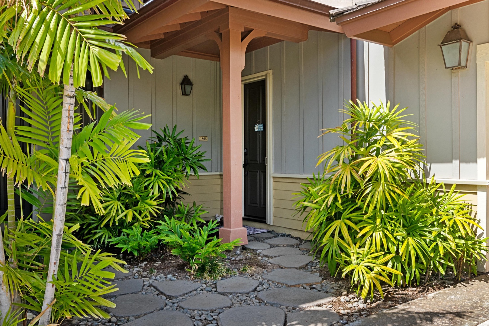Covered lanai with tropical landscaping