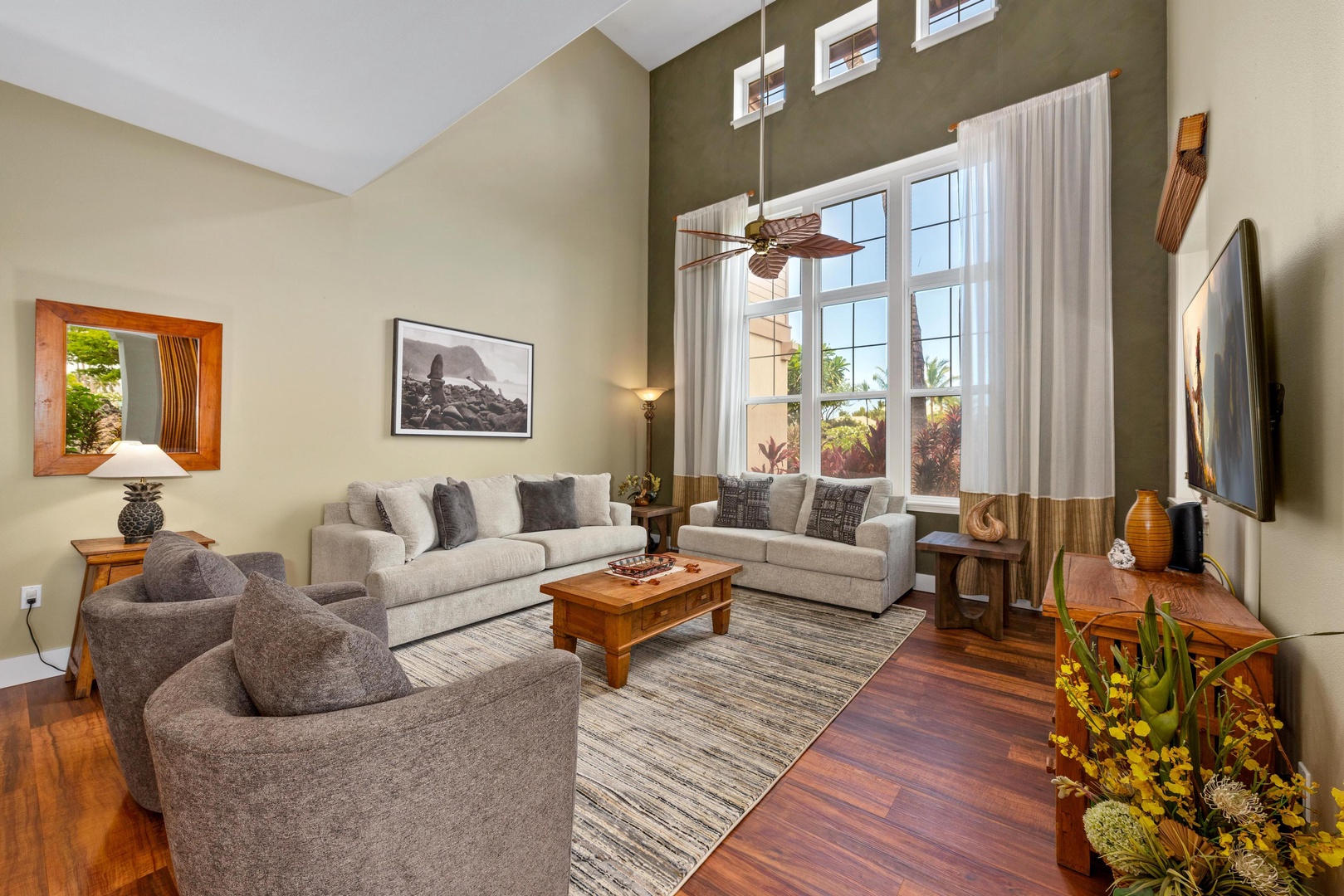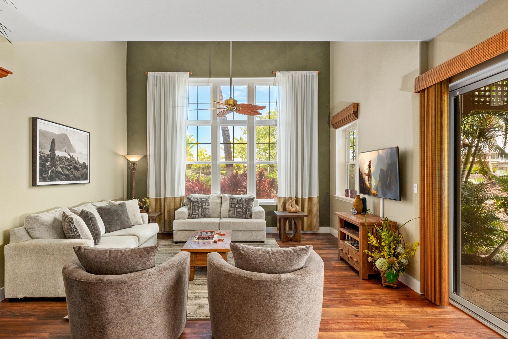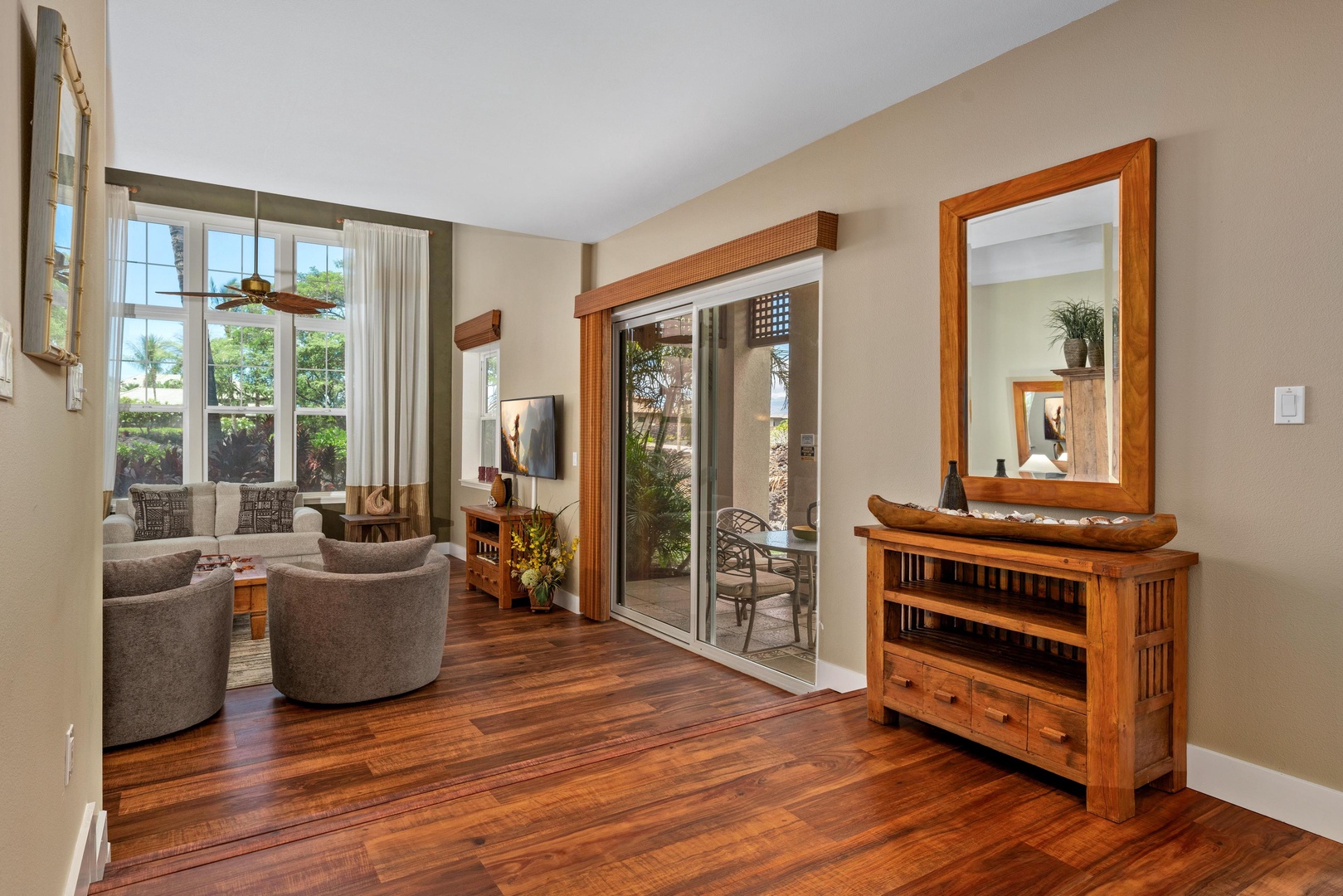 Covered lanai with tropical landscaping