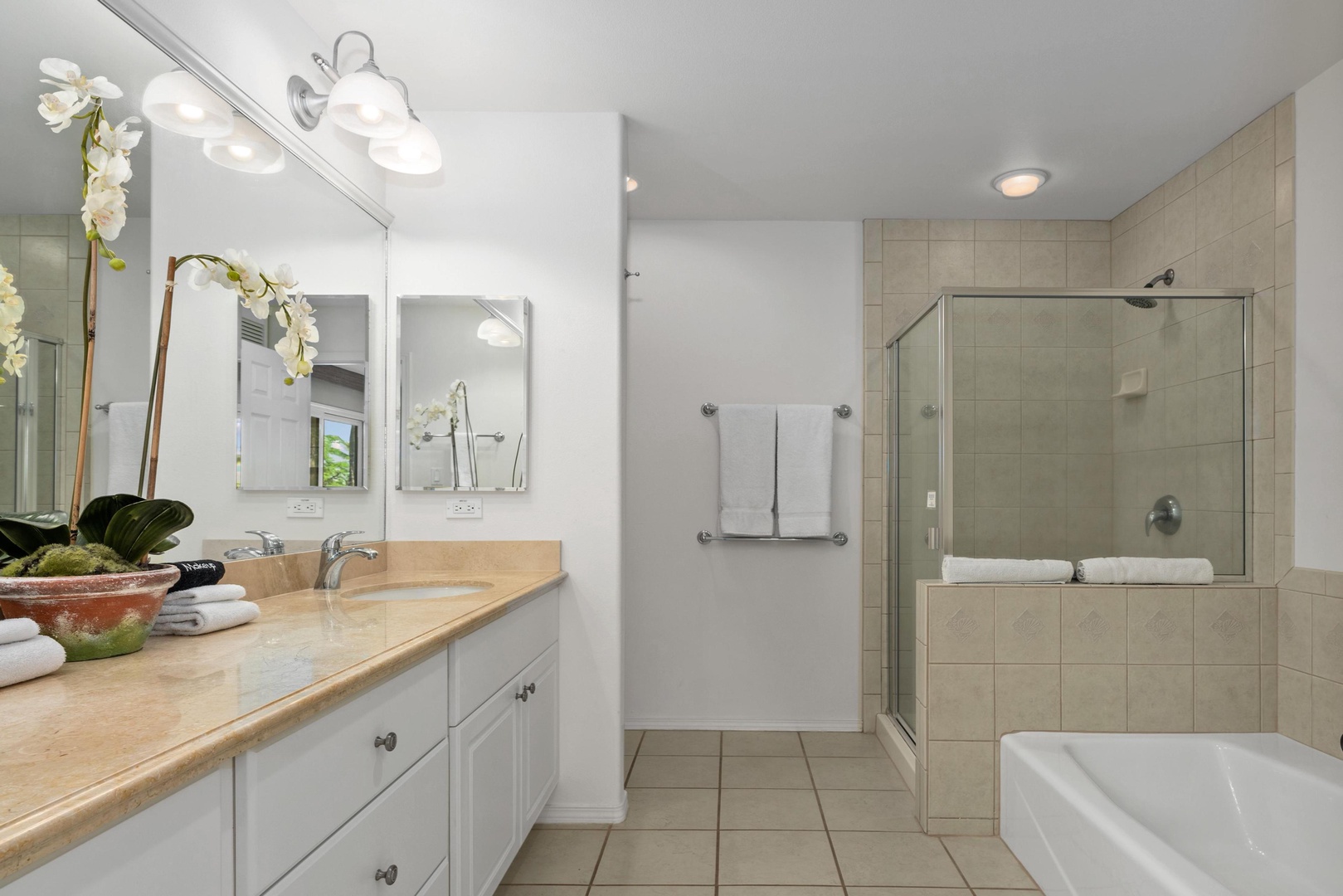 Ensuite primary bath features dual sinks, walk-in shower, and tub