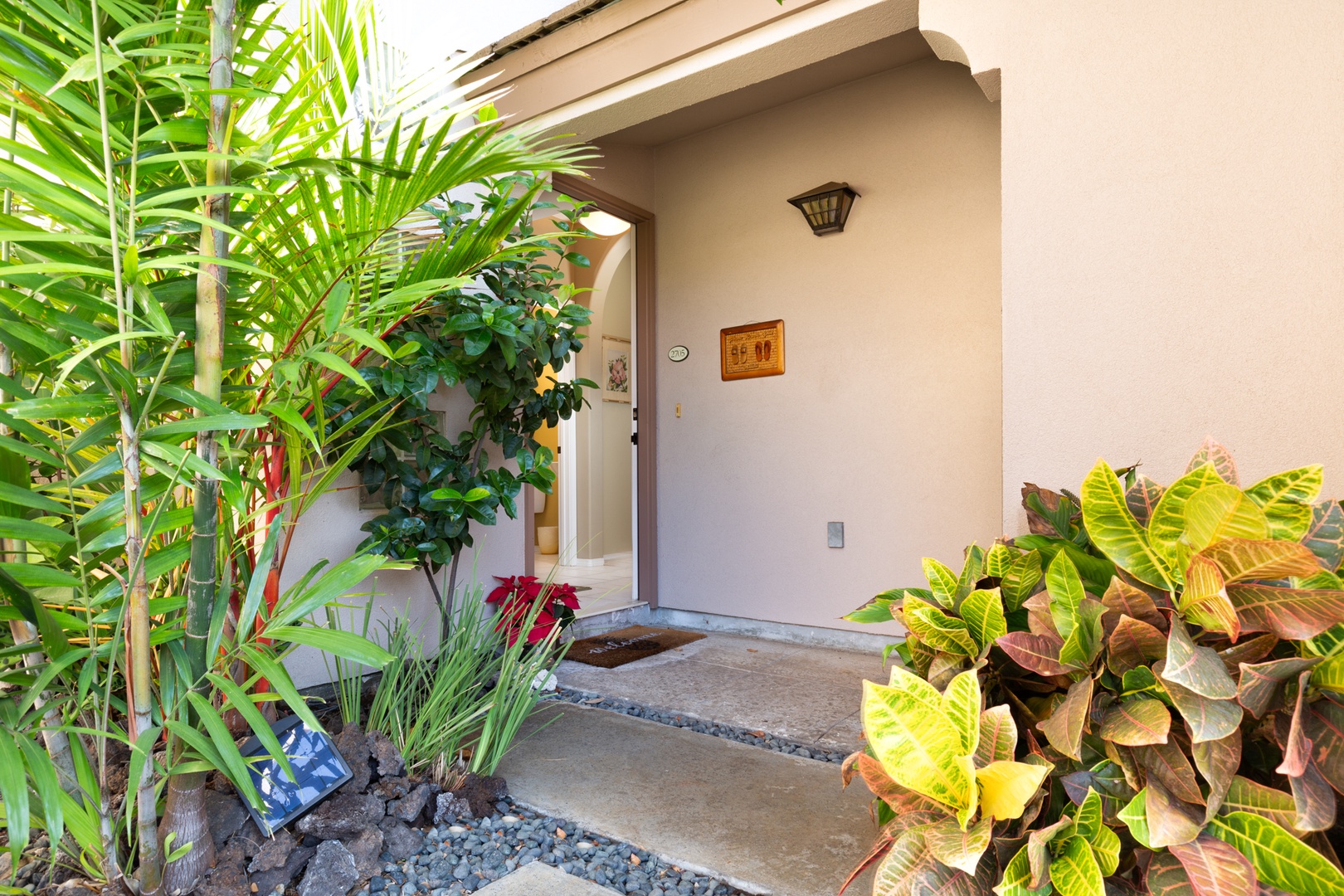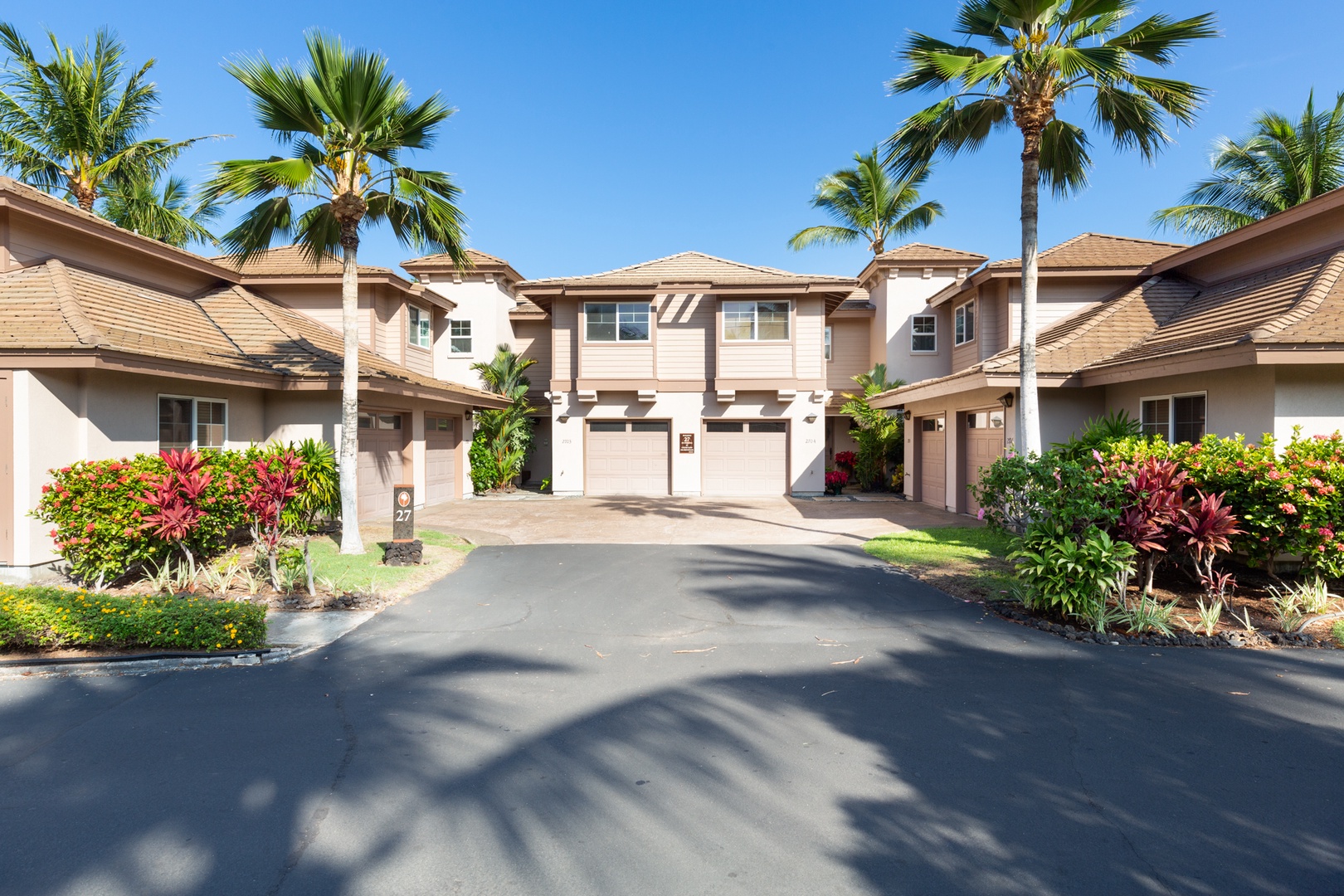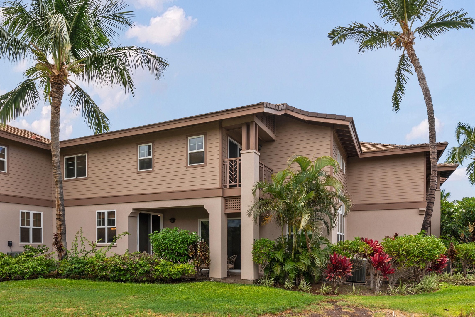 Two story villa with beautiful tropical landscaping.