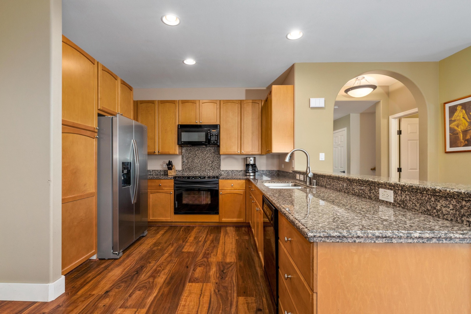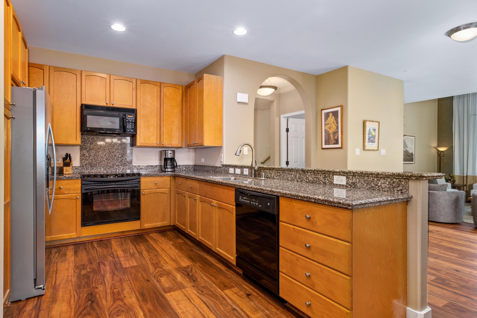 Full kitchen with granite countertops and modern appliances