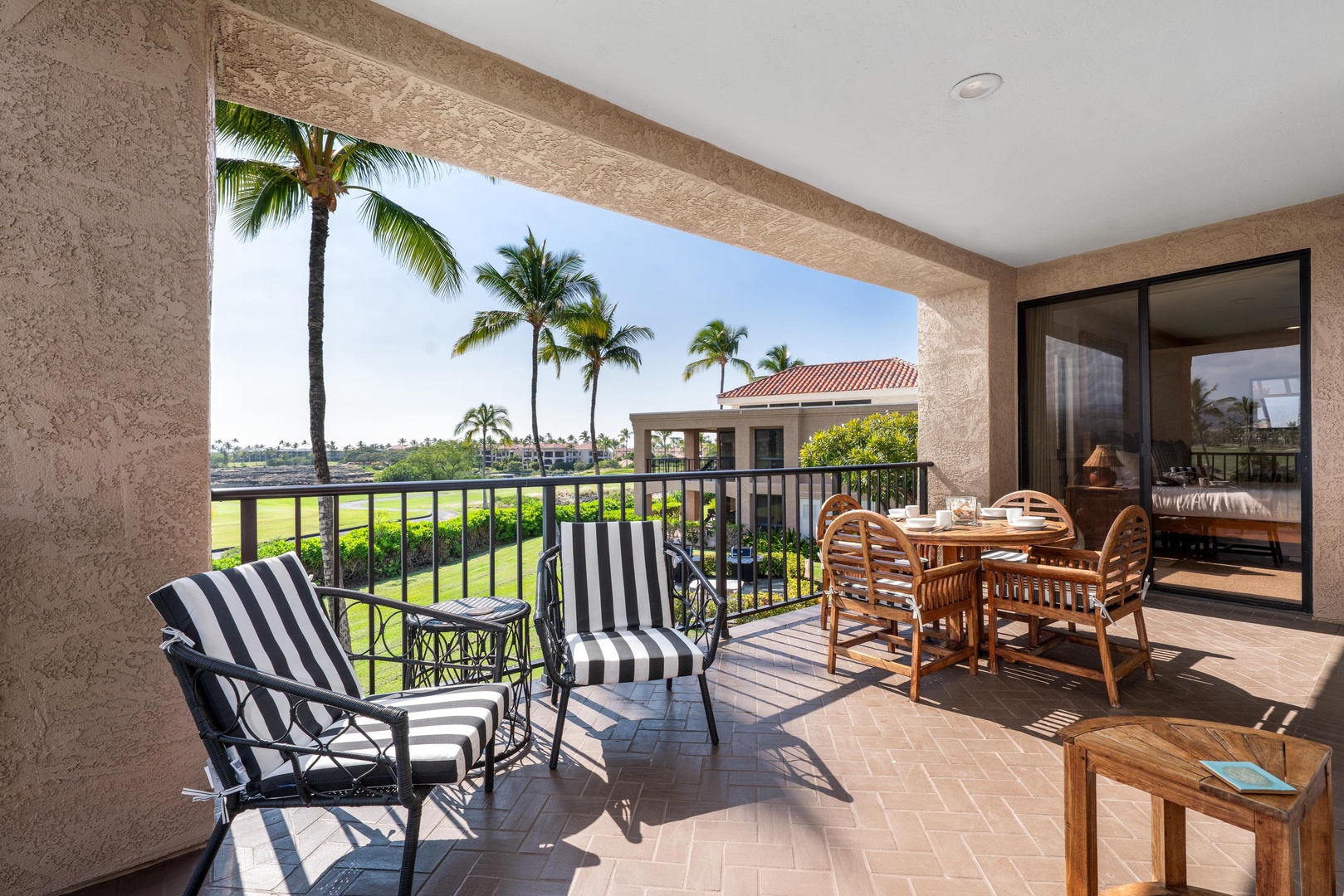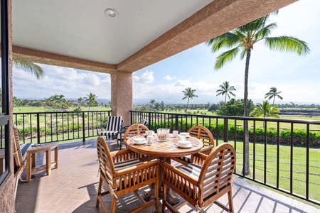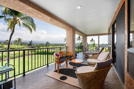 Unwind on your private covered lanai with comfortable seating overlooking tropical golf course views—perfect for morning coffee or sunset relaxation.