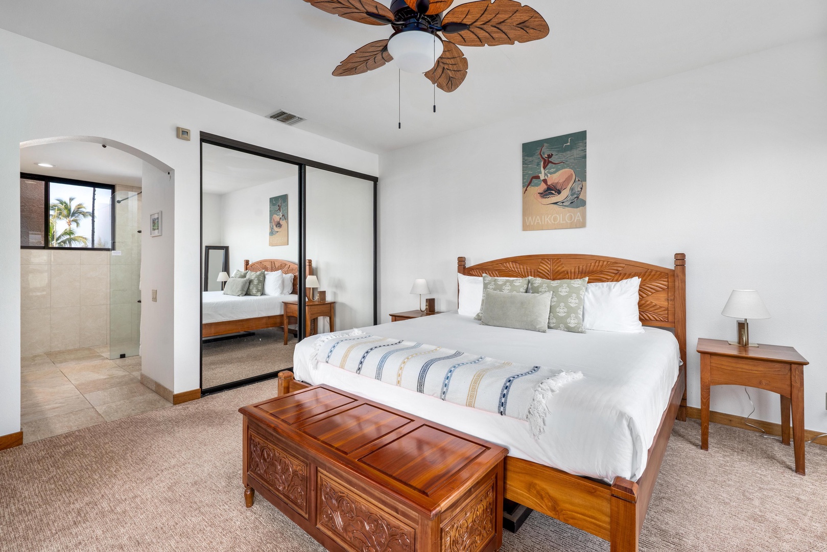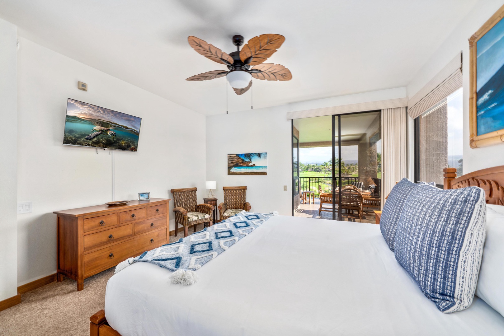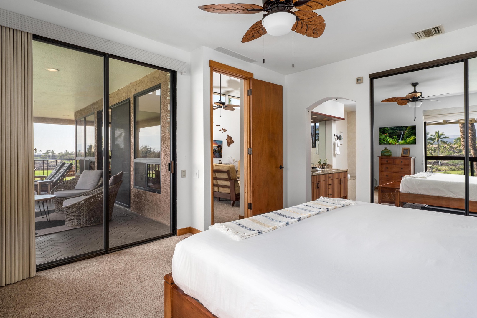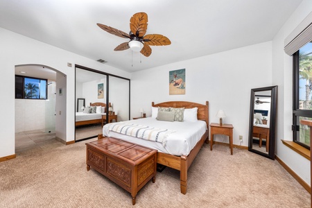 Comfortable primary bedroom with island-inspired décor, cozy furnishings, and private lanai access