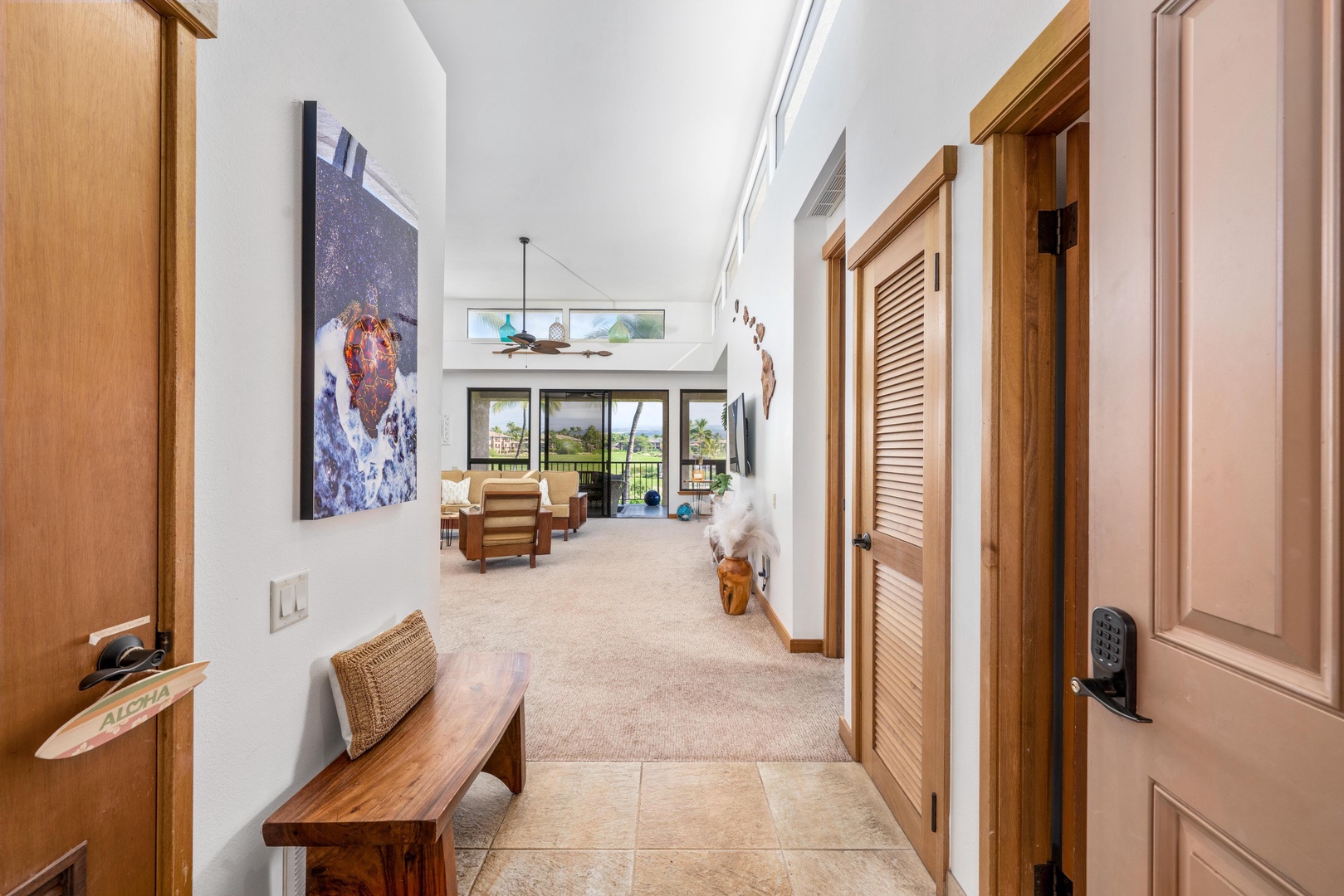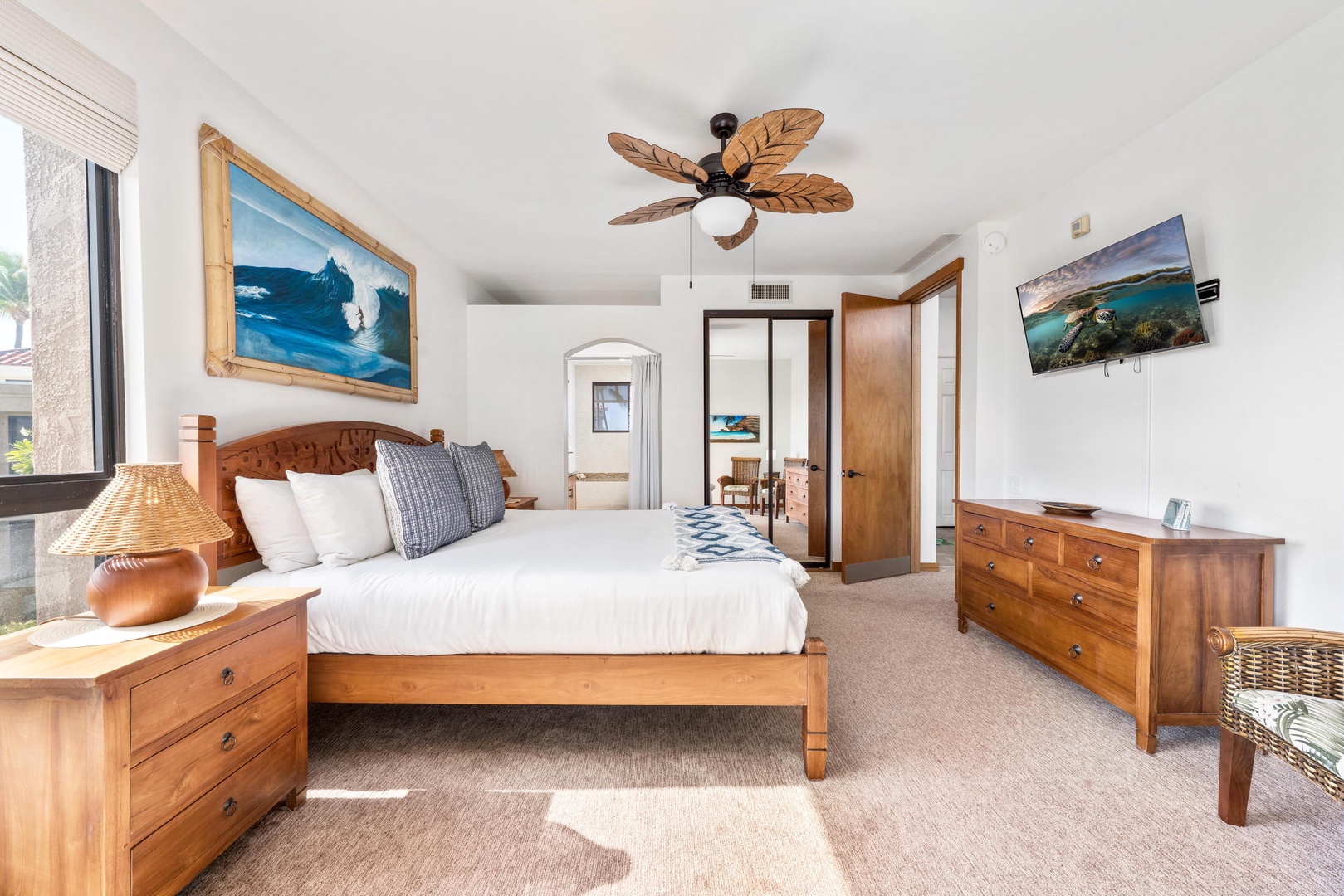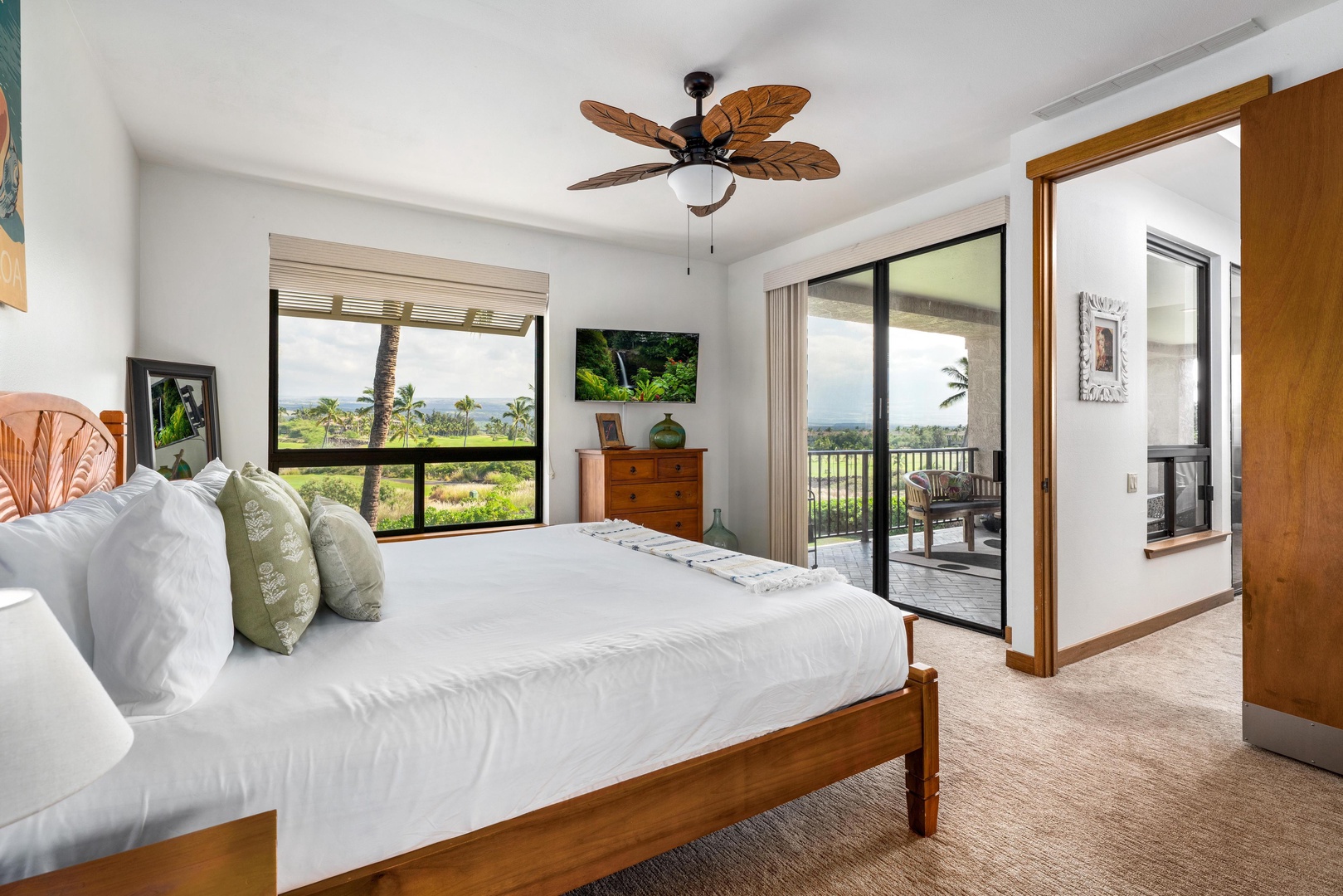 Comfortable primary bedroom with island-inspired décor, cozy furnishings, and private lanai access