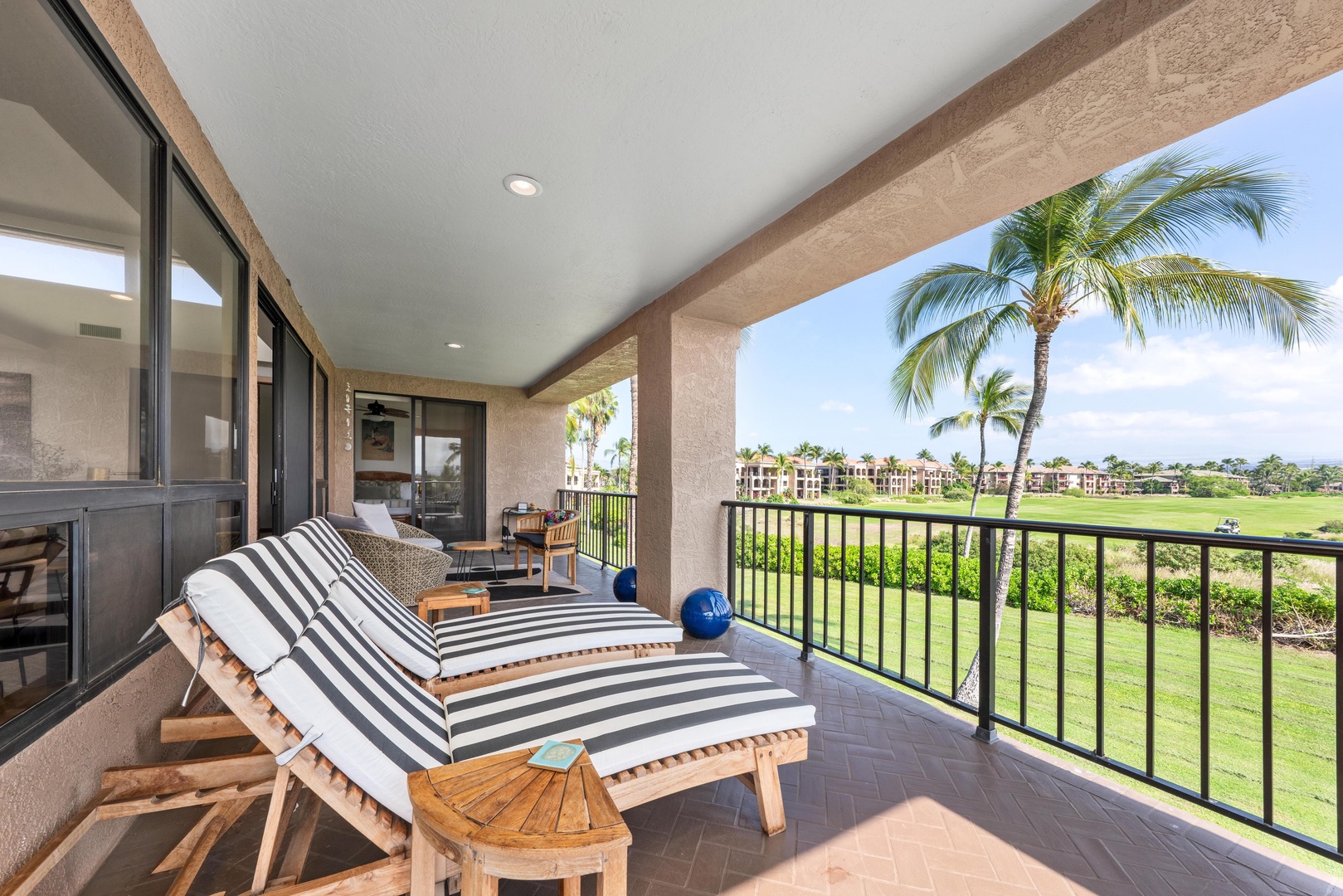 Unwind on your private balcony with striped loungers overlooking lush golf course greens
