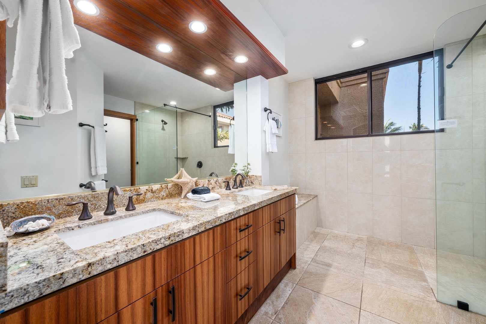 Step into your luxurious ensuite bathroom featuring dual granite vanities, a spacious walk-in shower, and warm wood accents that create a spa-like retreat.