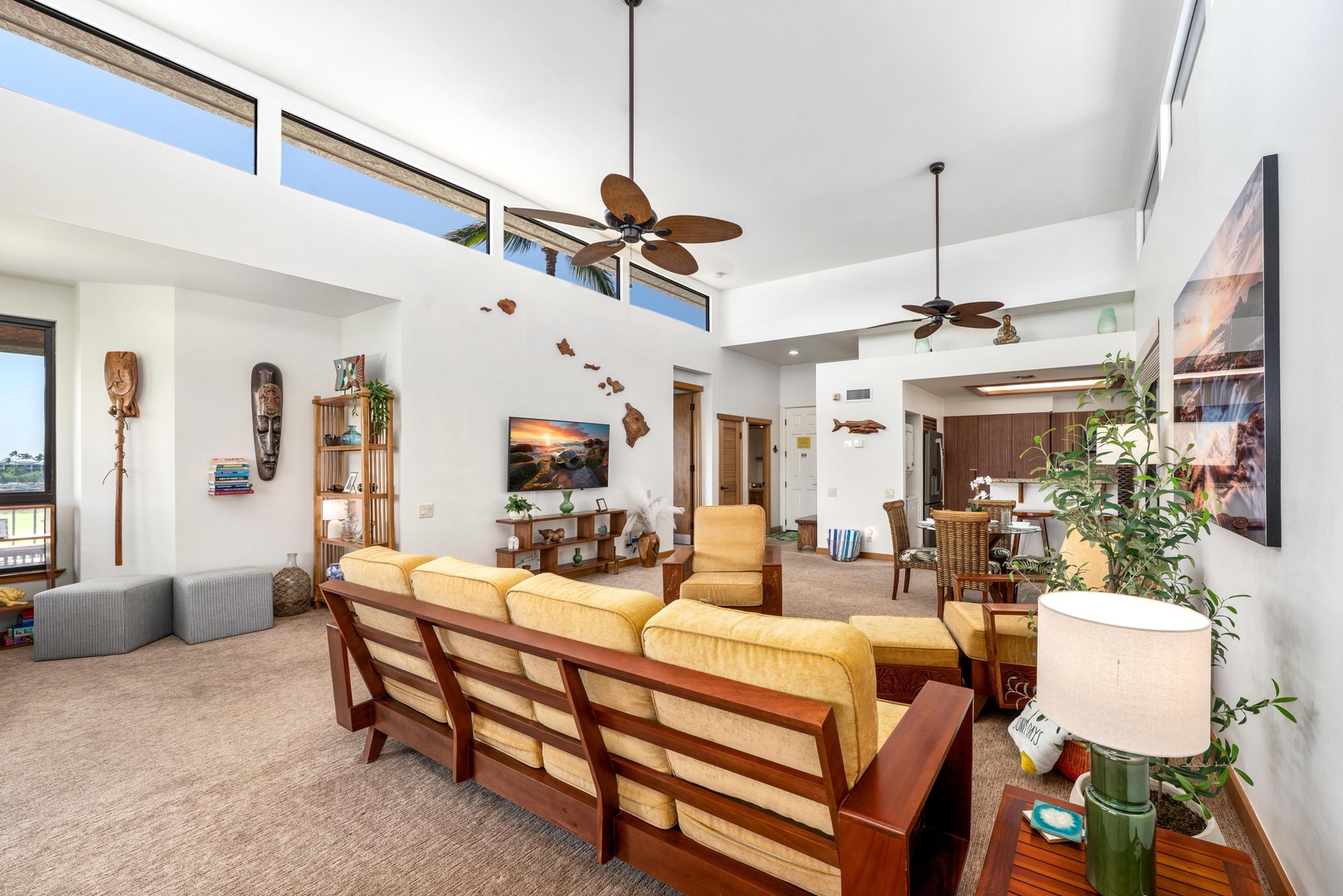 Relax in your spacious open-concept living area with stylish tropical furnishings
