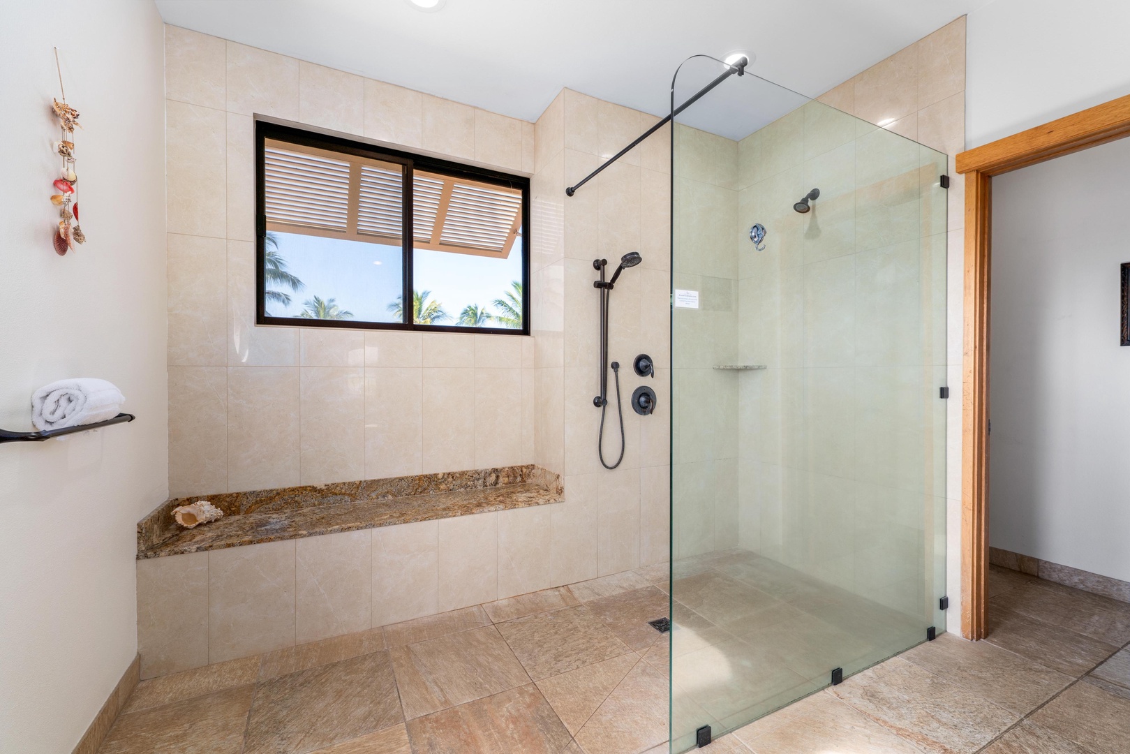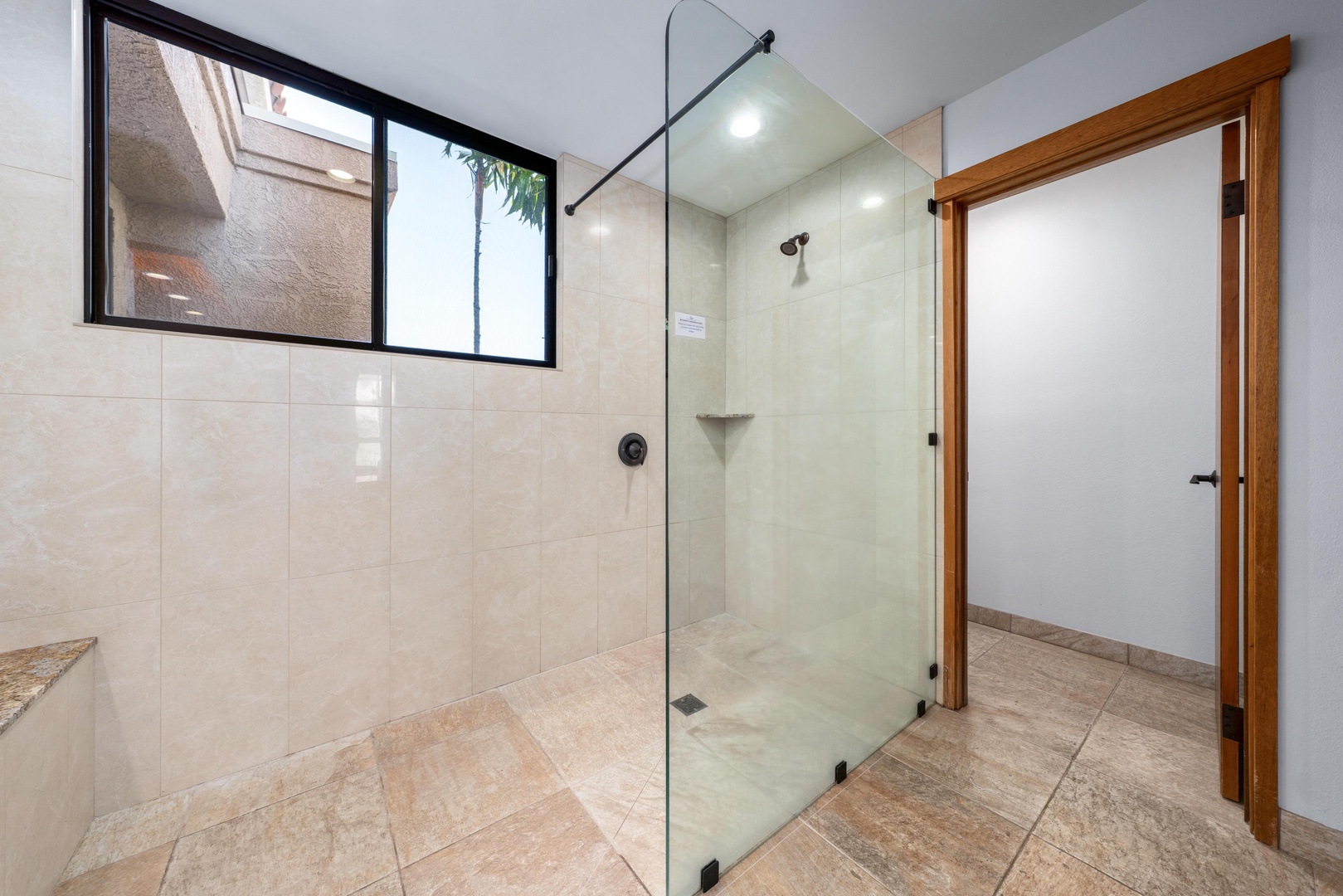 Step into your spacious glass-enclosed shower with natural light streaming through the window, creating a bright and airy bathing experience.