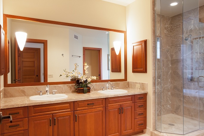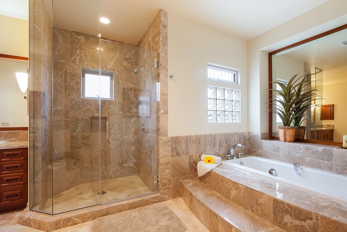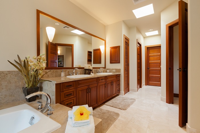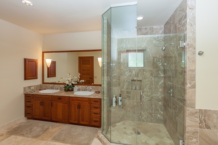 Guest bathroom with double vanity, walk-in shower, and soaking tub