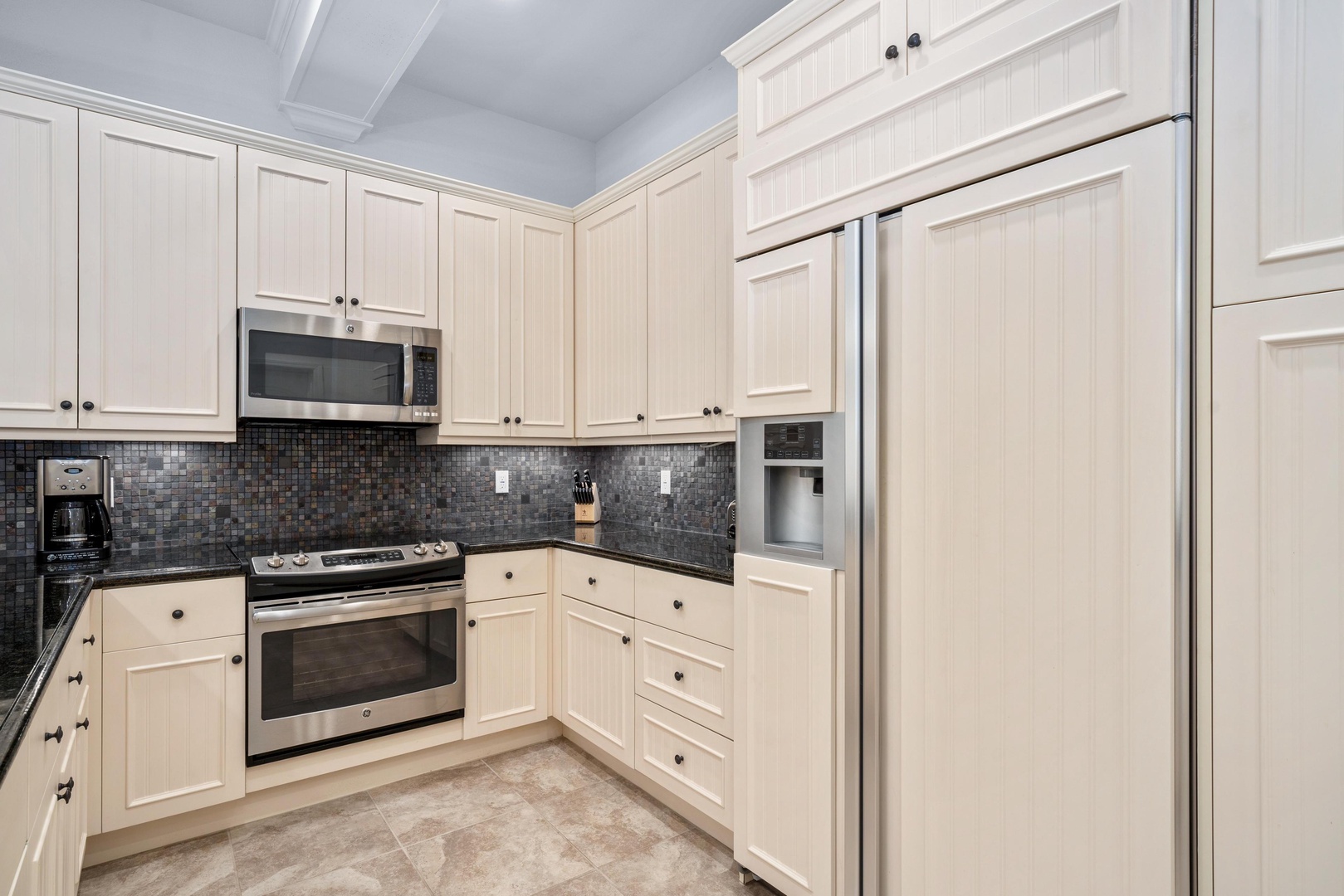 Full kitchen with breakfast bar, granite counters, and modern appliances