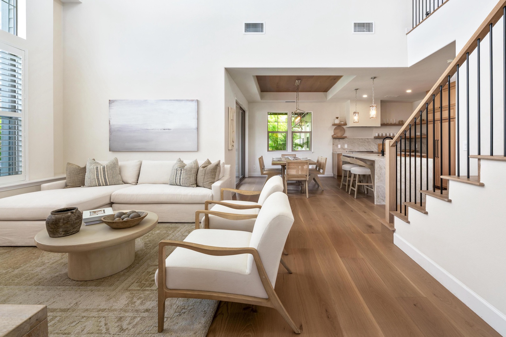 Unwind in your elegant open-concept living space, where warm wood floors and modern furnishings create the perfect retreat.