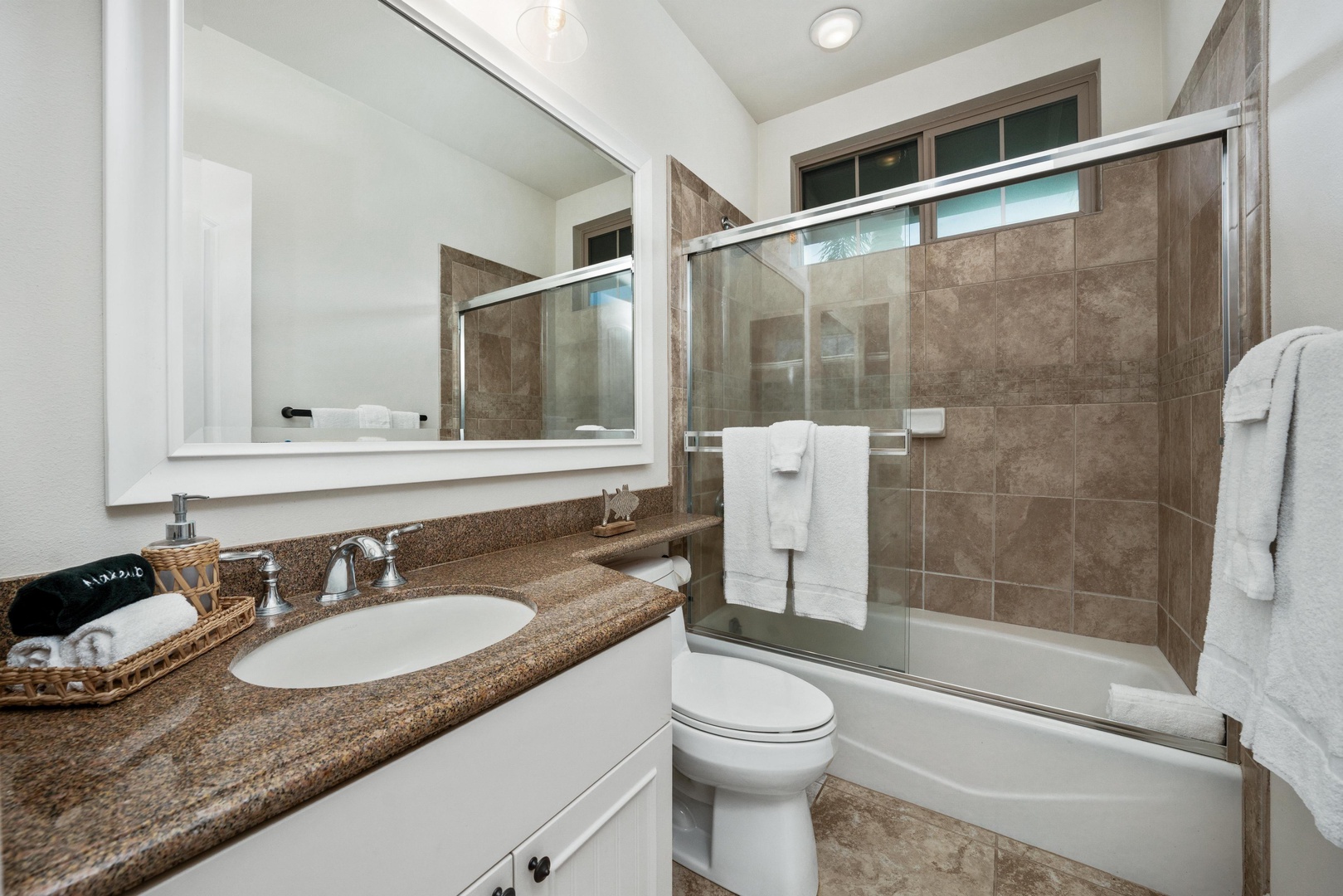 Refresh in your private bathroom featuring granite countertops, glass shower doors, and plush towels awaiting your arrival.