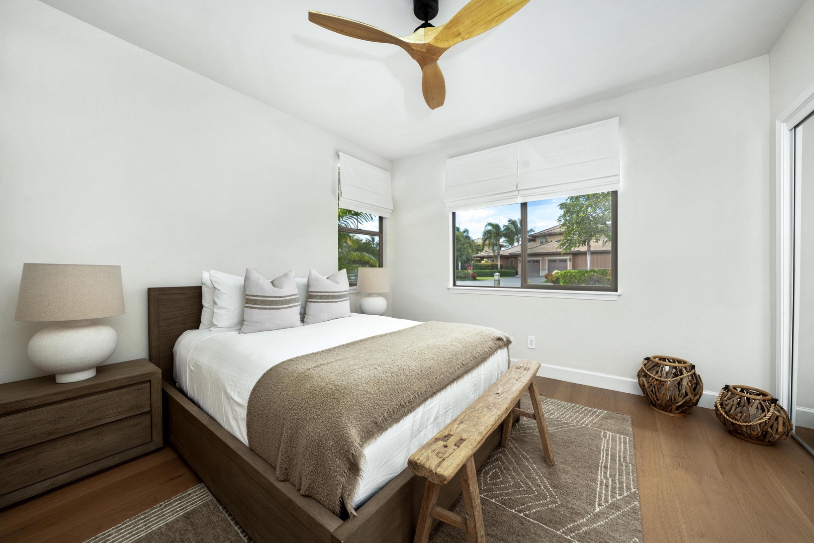 Wake up to tropical palm views from your serene bedroom, where coastal artwork and elegant furnishings create your perfect island retreat.
