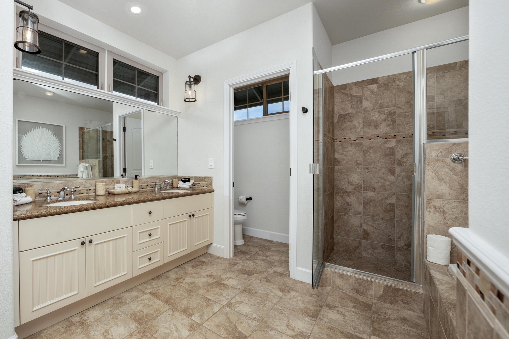 Your private retreat features a spacious bathroom with elegant stone tile, dual vanities, and a luxurious walk-in shower perfect for unwinding.