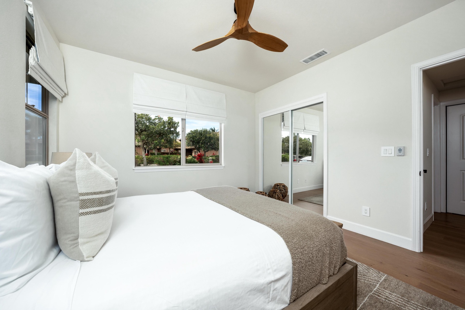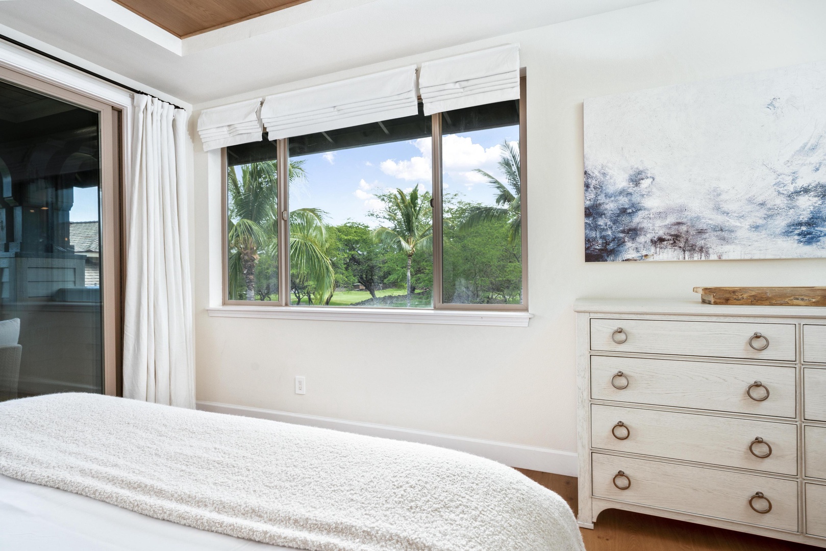 This beautifully appointed residence offers a refined blend of modern luxury and island serenity. The dramatic two-story living space features wide-plank 9-inch white oak floors, abundant natural light, and freshly painted interiors throughout. The home has been entirely re-curated with furnishings, rugs, and drapery from Restoration Hardware, emphasizing natural, sustainable materials and soft linen textures that create an atmosphere that is both elegant and deeply calming. The fully remodeled kitchen is designed for both beauty and function, showcasing a waterfall island, quartzite countertops, white oak cabinetry with open shelving, designer appliances, and a reverse-osmosis water filtration system. Additional upgrades include a new LG washer and dryer. The living area invites relaxation with plush linen seating and a wool rug, while the bedroom retreats feature Stearns & Foster plush mattresses, bamboo mattress pads, resort-quality linens, cooling silk inserts, and a choice of down or down-alternative pillows for truly restorative sleep. Step outside to private patios overlooking the Mauna Lani golf course—perfect for quiet mornings or leisurely outdoor meals in the island breeze. Well situated in a quiet resort setting, the home is a lovely walk to the Fairmont Orchid and Mauna Lani Auberge Resorts, as well as world-class beaches, dining, and scenic coastal trails.