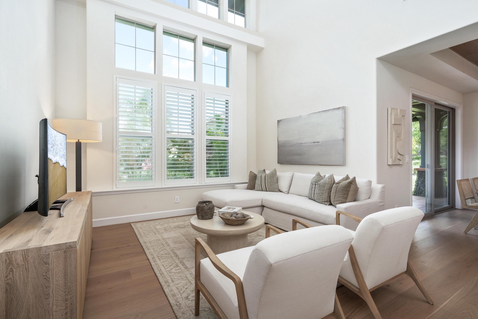 Relax in your bright, airy living space where natural light streams through tall windows onto plush seating and warm wood floors.