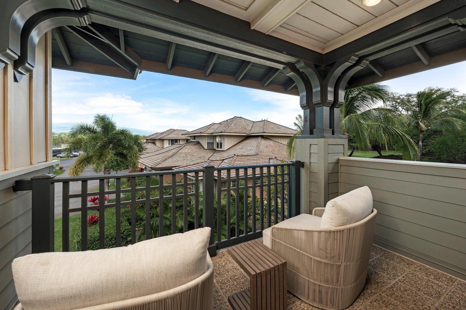 Unwind on your private balcony with comfortable seating, overlooking lush tropical gardens and distant mountains in this peaceful Hawaiian setting.