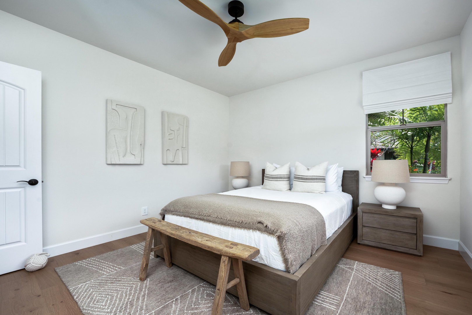 Drift into peaceful sleep in your stylish bedroom, where modern comfort meets warm wood tones and gentle breezes from the ceiling fan.