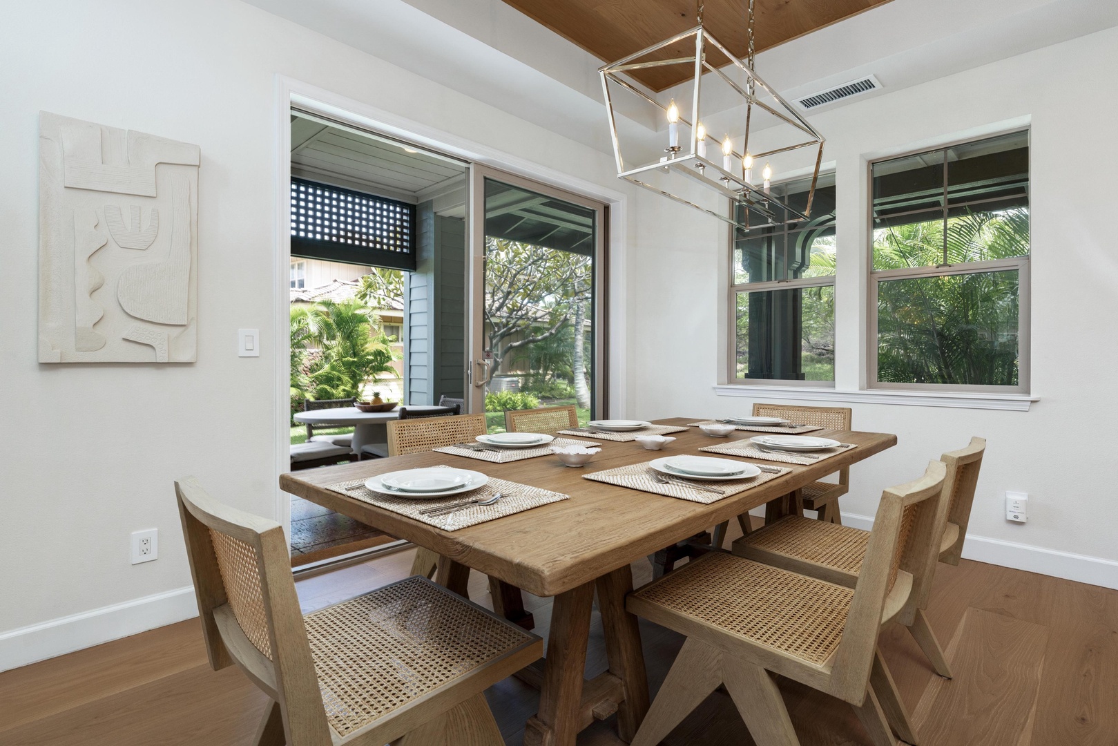 Gather around your elegant dining table where warm wood meets modern style, perfect for sharing memorable meals with tropical garden views.
