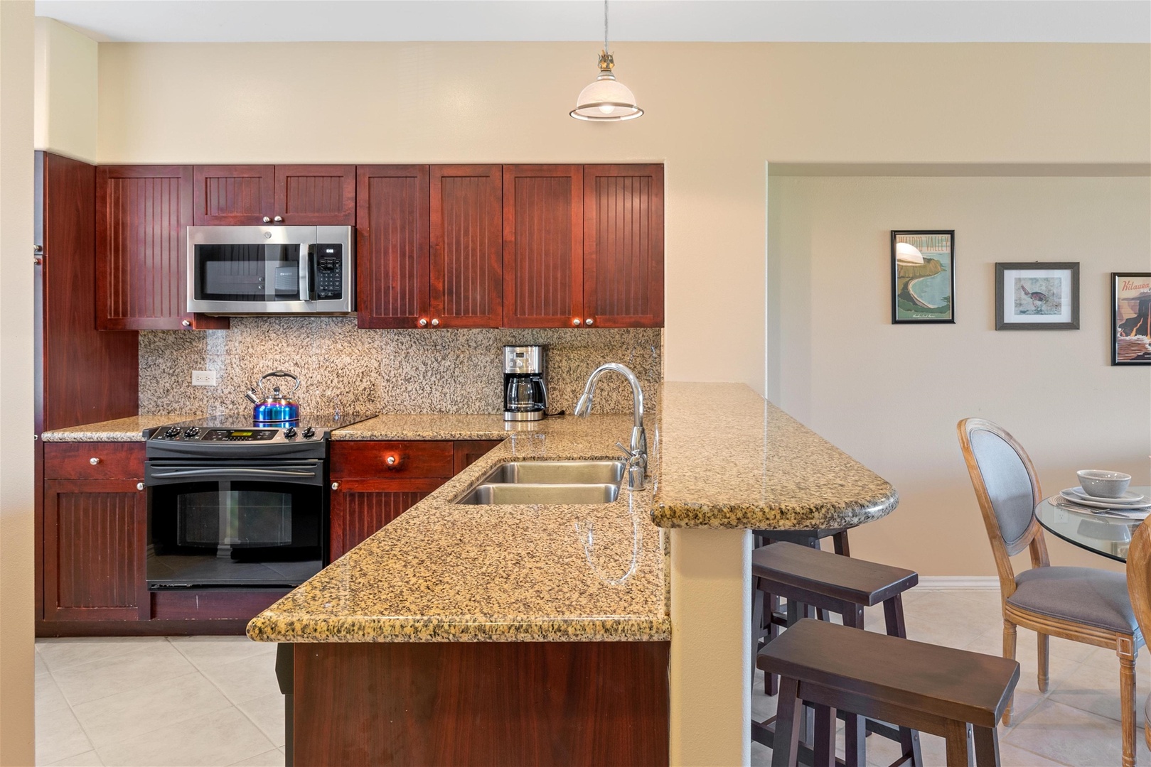 Full kitchen with breakfast bar, granite counters, and modern appliances