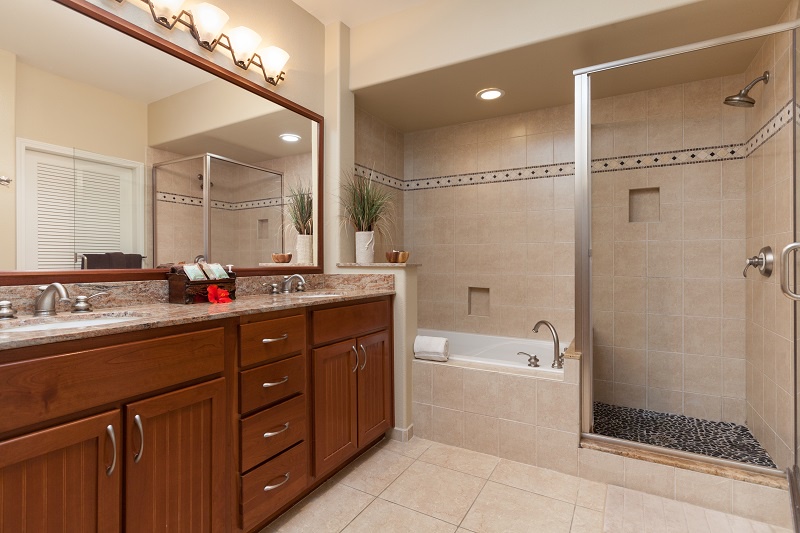 Ensuite primary bathroom with double vanity, walk-in shower, and soaking tub