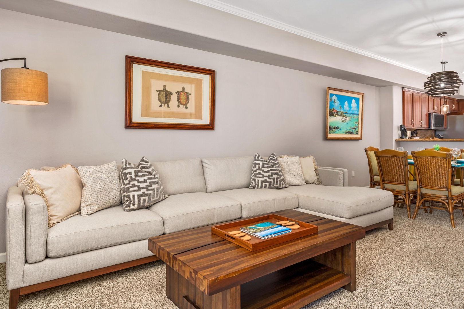 Sink into this plush sectional sofa where coastal artwork and warm wood accents create your perfect retreat for relaxation and conversation.