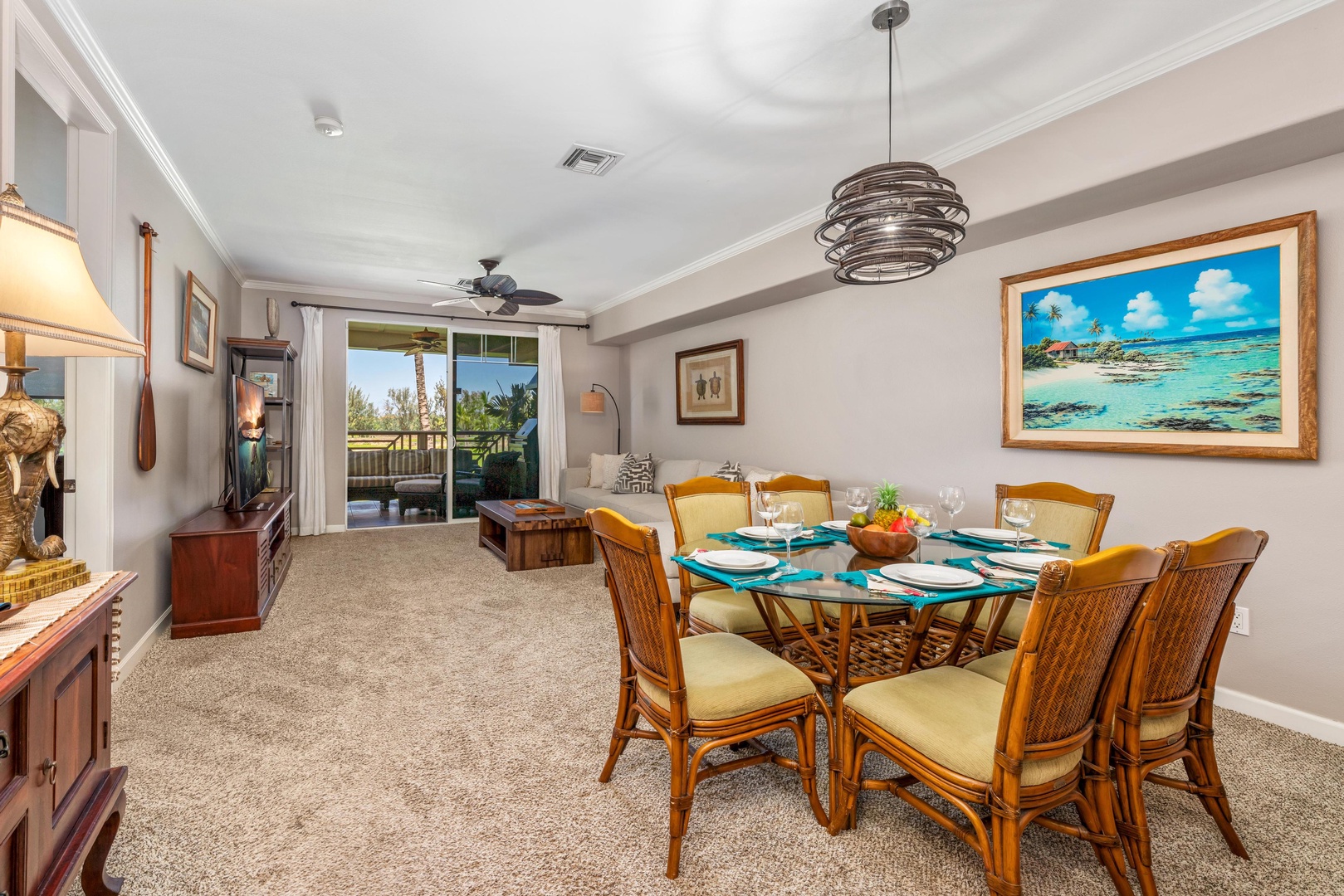 Gather around your elegant dining table for memorable meals, with tropical artwork and sliding doors opening to your private outdoor space.