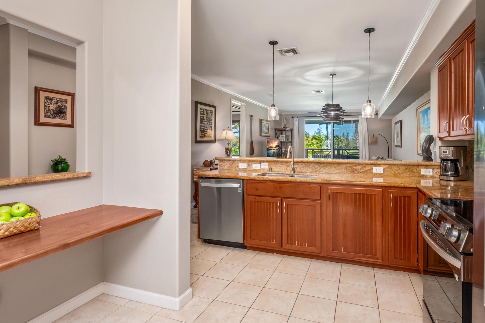 Relax in your spacious living area with plush seating, tropical ceiling fans, and ocean-themed artwork that brings Hawaiian charm to every moment.