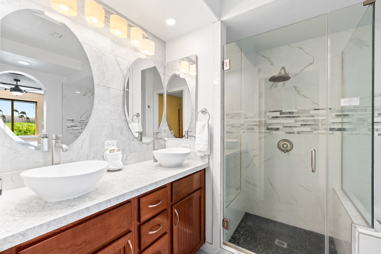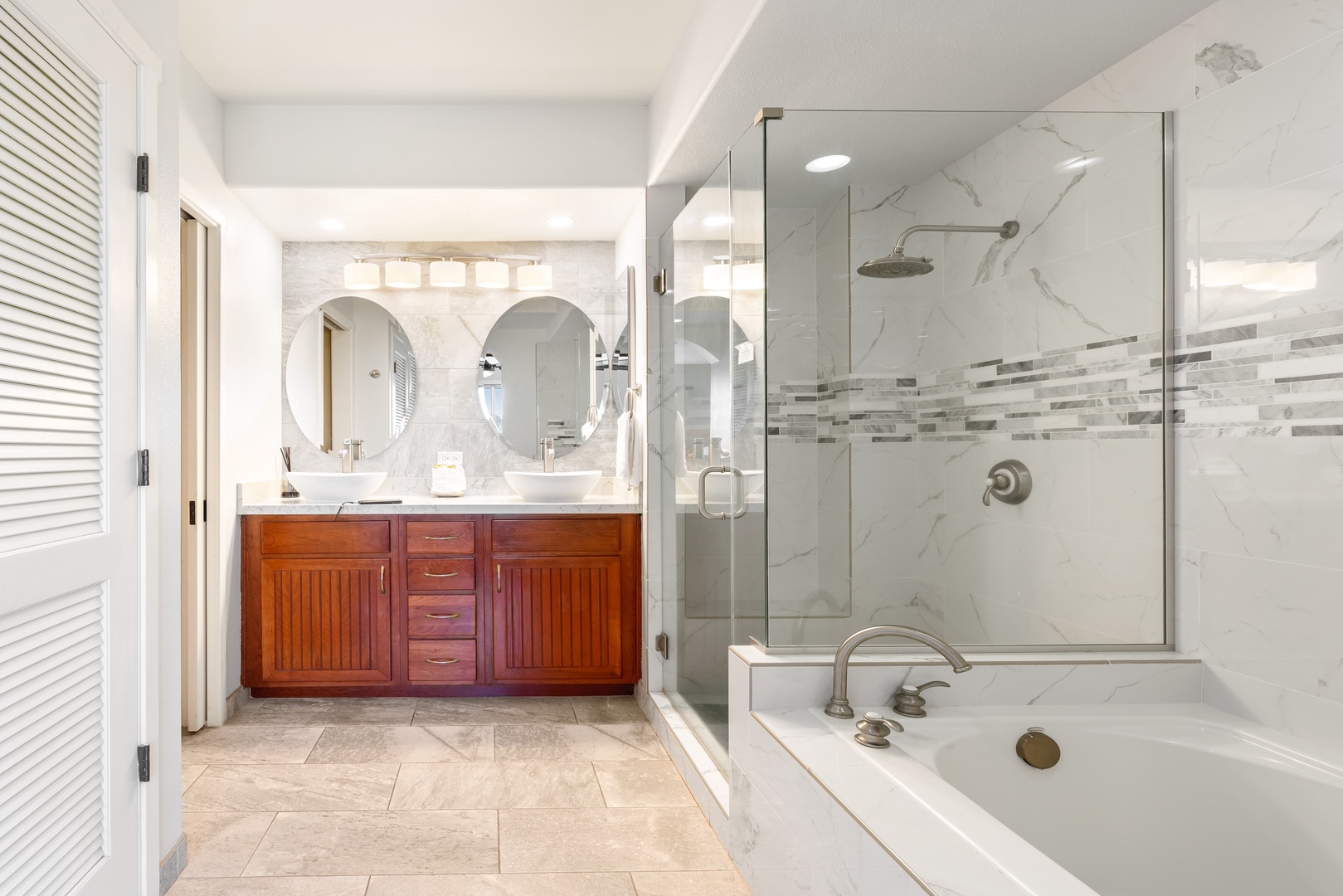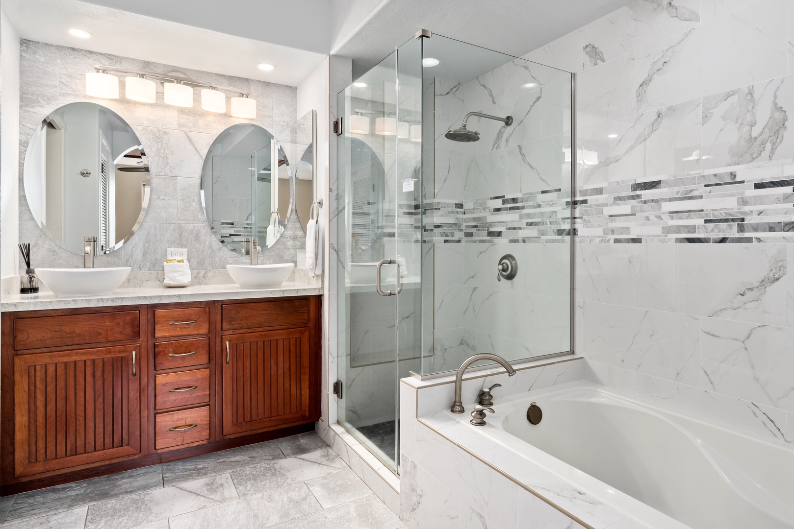 Ensuite primary bathroom with double vanity, walk-in shower, and soaking tub