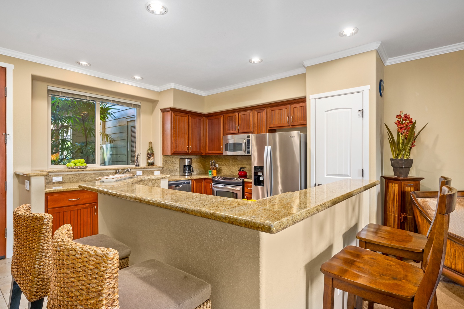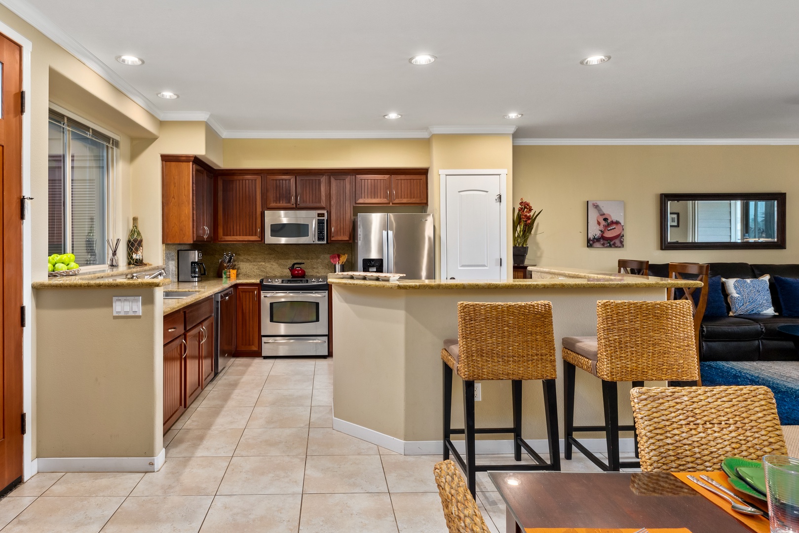 Full kitchen with granite countertops, breakfast bar, and stainless steel appliances
